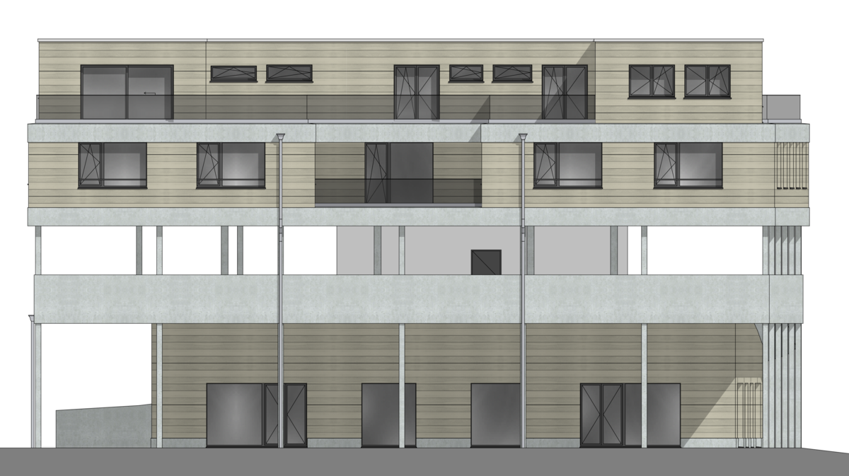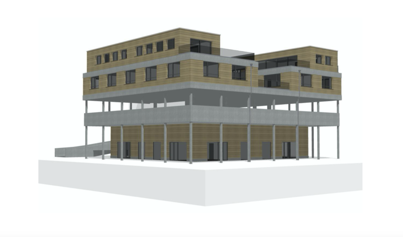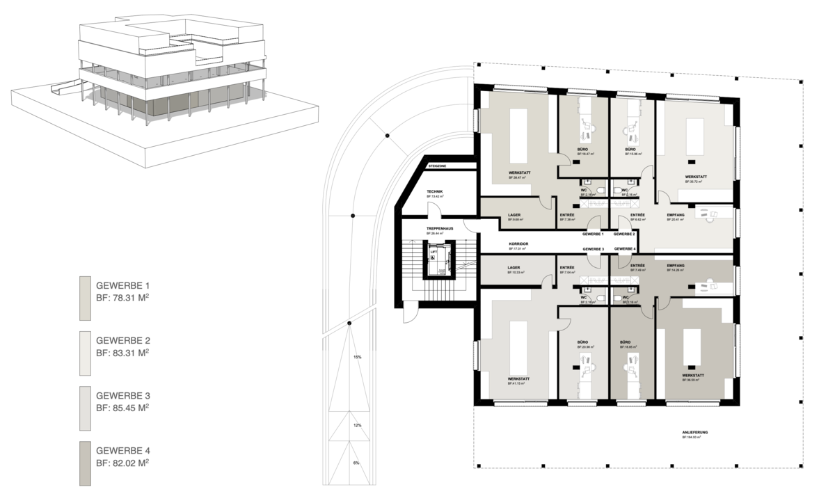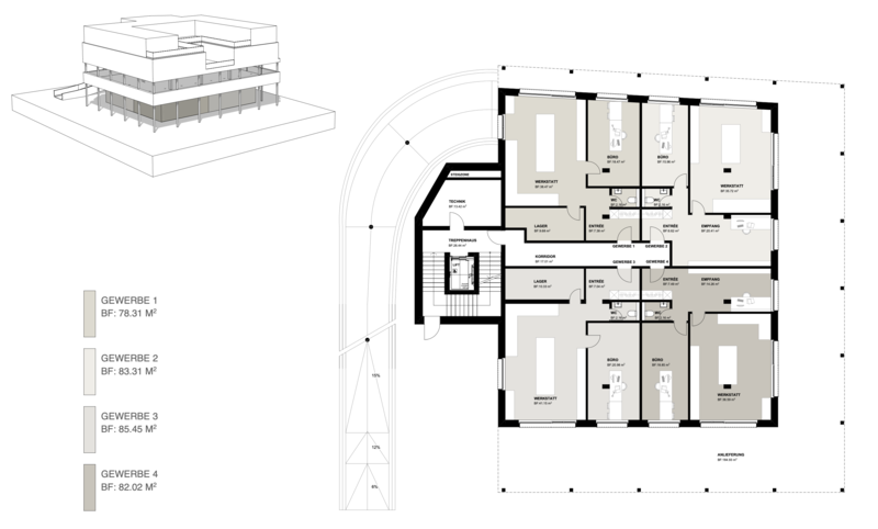 - Der Neubau umfasst mindestens ein oberirdisches Geschoss für Gewerbe