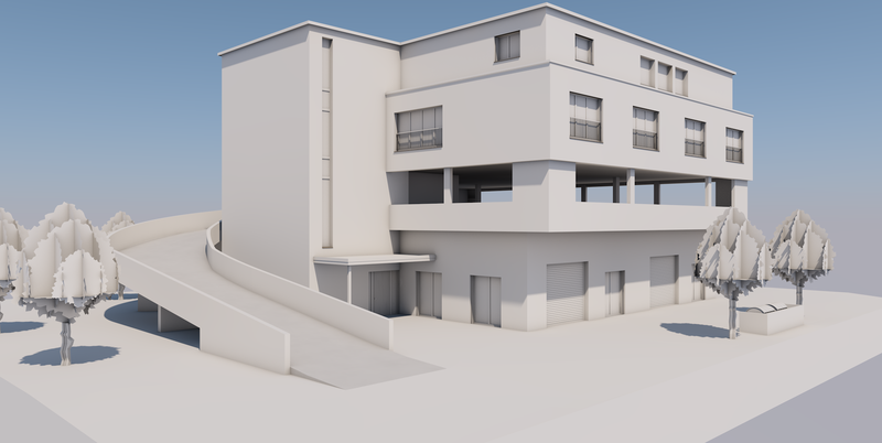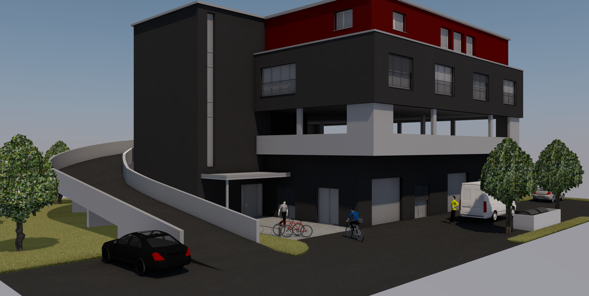 Im Rahmen der Vorgaben des Bauherrn wurde das Bauvorhaben mit den geforderten Gewerbe- und Büroräumen sowie dem Wiederaufbau des Pavillons entworfen. Durch das Stützenraster in den Gewerbe-Neubaugeschossen konnte eine möglichst freie Raumeinteilung, die für potenzielle Mieter sehr interessant sein kann, geschaffen werden. Im Erdgeschoss sind, wie in den oberen Abschnitten erwähnt, Gewerberäume angedacht, die folglich mit einer Raumhöhe von 4.10m geplant sind. Die Raumhöhe von 4.10m erlaubt es, in den hinteren Mietflächen Maschinen oder sonstige Werkzeuge, welche für gewerbliche Aktivitäten notwendig sind, einzurichten. Bei dem strassenseitigen Raum wurde eine Autowerkstatt, deren grosszügige Räumlichkeiten mit zwei Garagentoren erschlossen sind, geplant. Der Haupteingang und der Korridor sind so konzipiert, dass auch grössere Lieferungen einwandfrei transportiert werden können. Ebenfalls ist das Bauprojekt so erschlossen, dass eine Lieferung von Aussen möglich ist. Ein weiterer Bestandteil der Arbeit war auch ein Parkdeck über dem gewerblich genutzten Neubau, welches auch für Kleinlastwagen von 3.5t und einer Höhe von 2.70m befahrbar sein soll. Dementsprechend wurde die Zufahrt und der Parkbereich normgemäss geplant. Die Benutzung des Parkdecks ist ausschliesslich für Mieter des Gewerbe- und Wohnteils gestattet, Besucher sollen die Parkplätze im Aussenbereich nutzen. Anstelle des bestehenden Pavillon wurden auf dem Parkdeck zur Generierung von zusätzlichen Mieteinnahmen Büroräume geplant. Abschliessend steht über dem Bürogeschoss der bestehende Holz- Elementbau, welcher vorgängig demontiert und wieder für das Wohngeschoss aufgebaut wird. Der frühere Ausstellungsbereich wird zu einer zweiten Wohneinheit umstrukturiert. Beide Wohnungen verfügen über eine grosszügige Wohnfläche und jeweils einen privaten Terrassenzugang mit intensiv Begrünung.