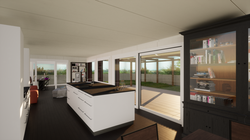 Das Wohnen mit dem Essen und der Küche ist so angeordnet, dass man beim Leben in der Wohnung die Aussicht ins Grüne geniessen kann. Die Trennwand vom Wohnen zum Büro kann geöffnet werden, um die beiden Räume zu verbinden.