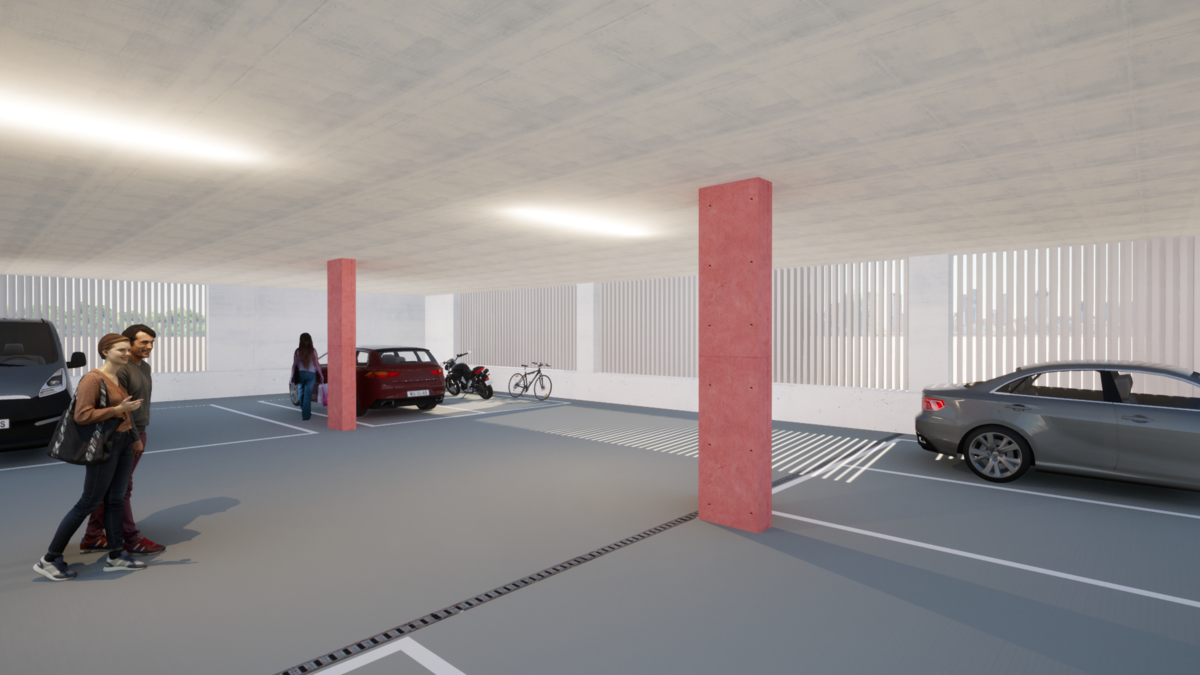 Im Obergeschoss befindet sich das Parking mit 12 Parkplätzen, welche zum Teil nachhaltige Elektroladestationen aufweisen. Zudem sind in diesem Stockwerk weitere Lagermöglichkeiten vorhanden.