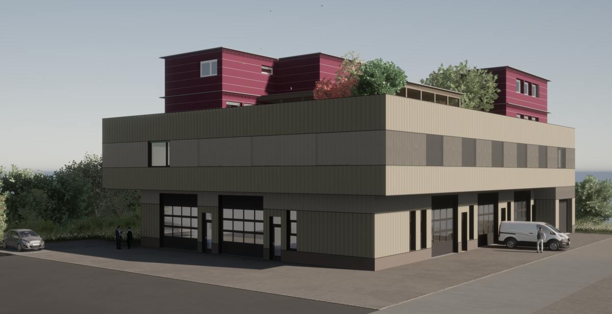 Die Idee ist es im Erdgeschoss möglichst viele Gewerbeeinheiten anzusiedeln, welche einen dirketen Zugang zur Zufahrtsstrasse haben. Die Gewerberäume haben alle ein grosses Sektionaltor damit verschiedene Fahrzeuge hereinfahren können. Jede Einheit hat eigene Nasszellen, Umkleideraum und Aufentahlsbereich mit Büro. Das Tragwerk wird durch ein Stützenraster gebildet, daher entsteht die Möglichkeit die Wände zwischen den Gewerbeeinheiten individuell zu verändern und Einheiten miteinander zu verbinden. Im 1. Obergeschoss befindet sich das Parking mit den genügenden PP Anzahl, zudem hat noch ein weiterer Gewerberaum Platz gefunden. Durch die Vermietung dieser Gewerbeeinheiten soll das Gebäude finanziert werden können. Zusätzlich wird der bestehende Holzpavillon auf dem Dachgeschoss in 2 Teilen wieder aufgebaut. Darin wird eine grosszügige Wohnung, sowie ein Büro/Dienstleistungsbetreib, Platz finden.