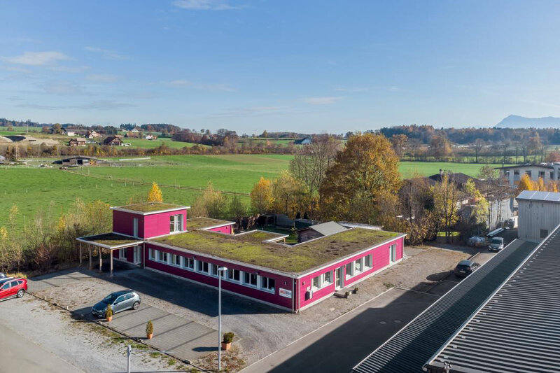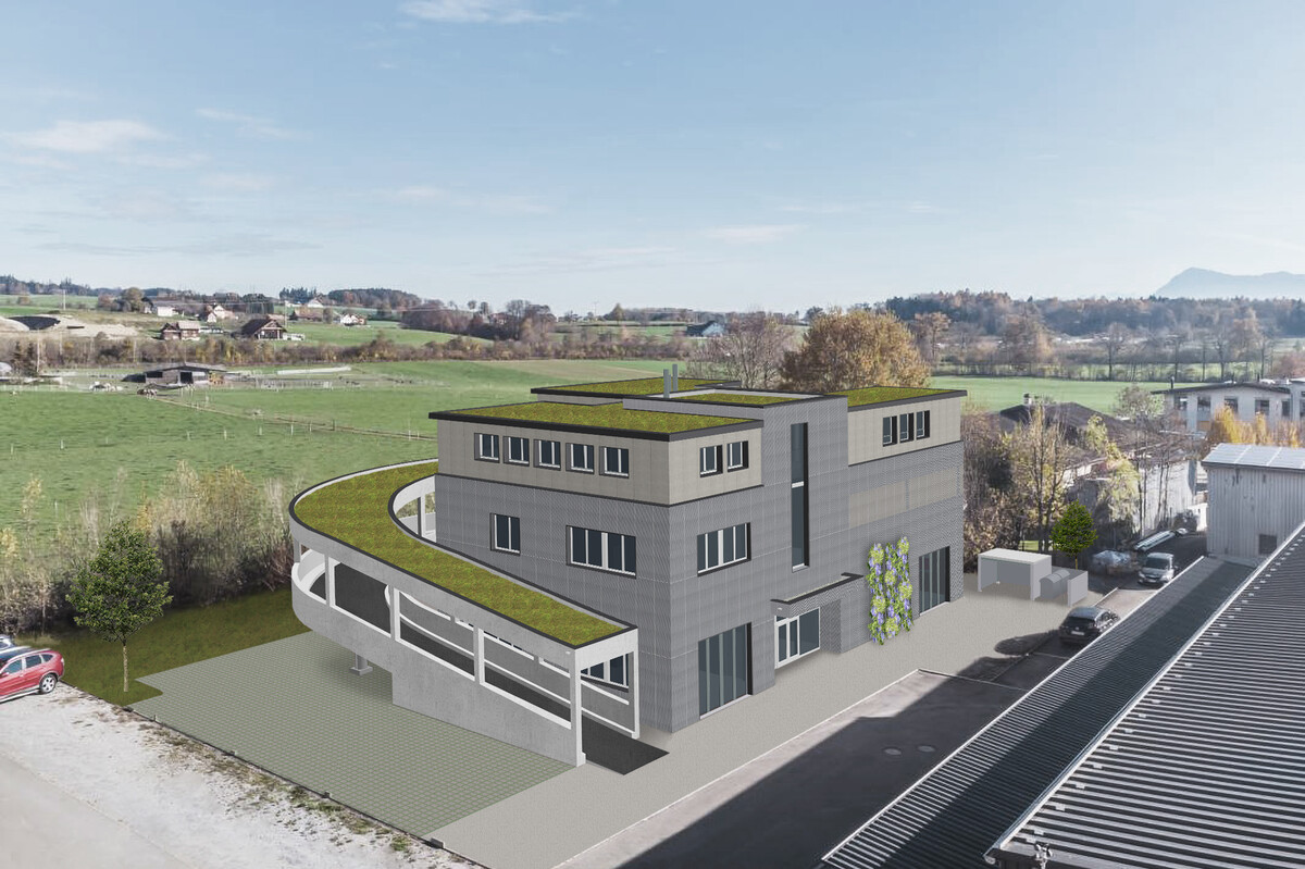 Im wiederverwendeten Elementbau sind eine attraktive Wohnung für Betriebsinhaber/innen oder Personal sowie kleinere Büroräume entstanden. Für die Gestaltung der Umgebung und der Fassade waren nur wenige Vorgaben gesetzt. Mein Ziel war, ein harmonischer Baukörper zu entwickeln, der sich harmonisch in die Umgebung einfügt.