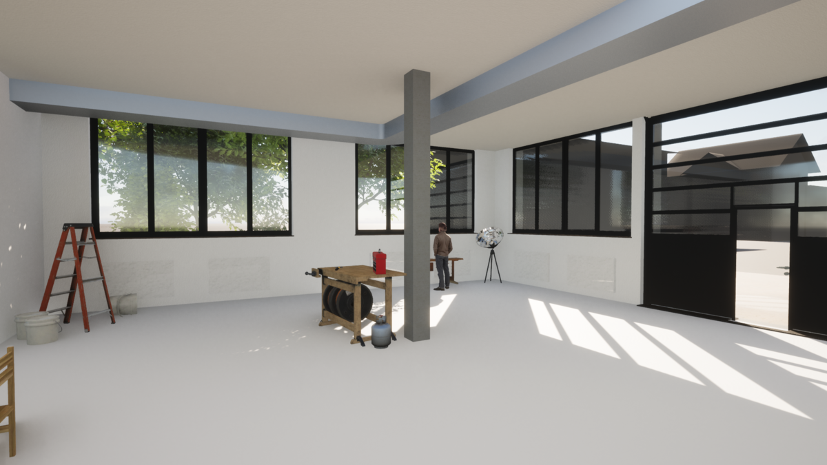 Zudem bietet der Entwurf mit dem Stützenraster die Möglichkeit, einzelne Räume mit Leichtbauwänden beliebig zu verändern.