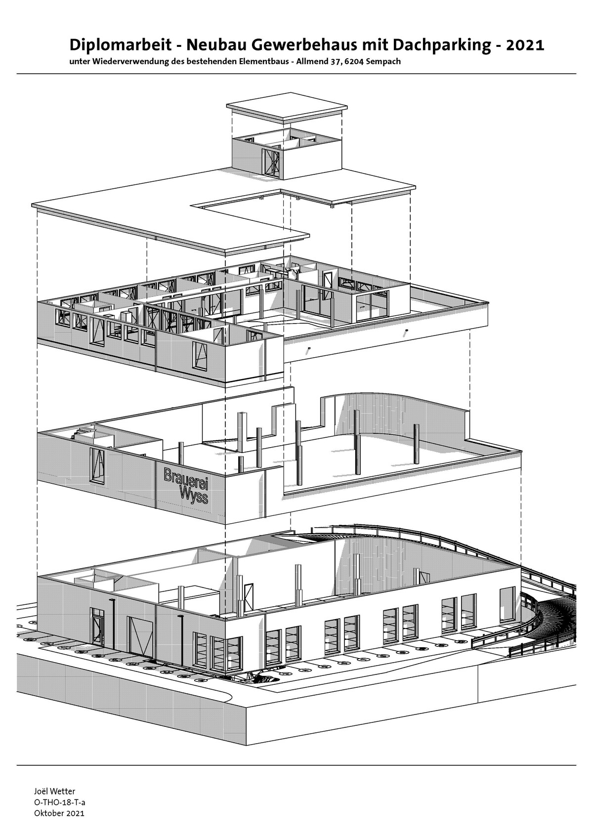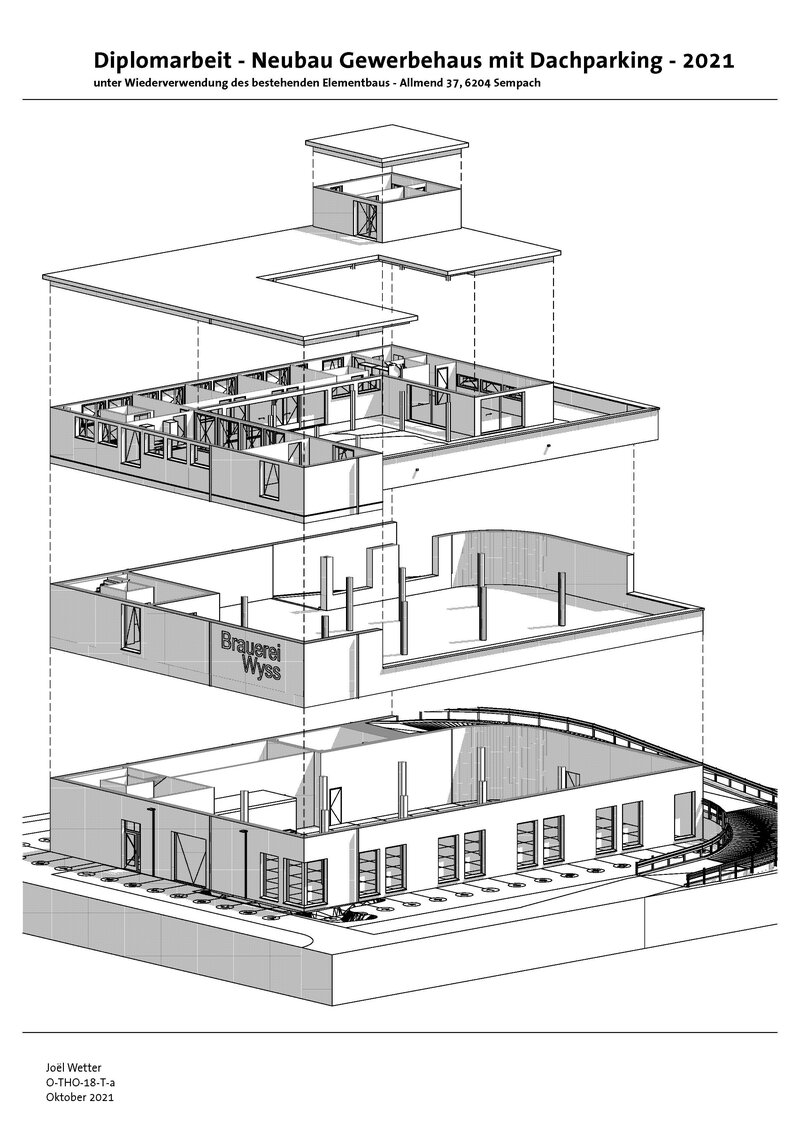 Auf der Parzelle 1296 in Sempach soll der bestehende Holzelementbau demontiert und eingelagert werden. Danach soll auf dem nun leeren Grundstück ein neuer Gewerbebau mit Dachparking realisiert werden. Der eingelagerte Bestand wird anschliessend über dem Parkdeck wieder aufgebaut.