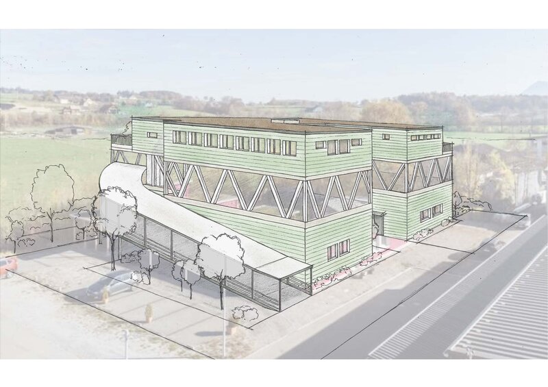 Auf der Parzelle im Gewerbegebiet Allmend in Sempach steht zurzeit ein modular aufgebauter Holzpavillon mit Innenhof und einem Aufbau im Obergeschoss. Da das Gebäude nun verkauft wurde und die Parzelle ein grösseres Ausnützungspotential zu bieten hat, möchte die Bauherrschaft ein Neubauprojekt realisieren. Sie will eine Gewerbeliegenschaft mit Obergeschossparking erstellen und den Holzpavillon wiederverwenden als Geschoss auf dem Parking. Der ökologische Aspekt ist für die Bauherrschaft von grosser Wichtigkeit und daher wird der 10-jährige Pavillon wiederverwendet.