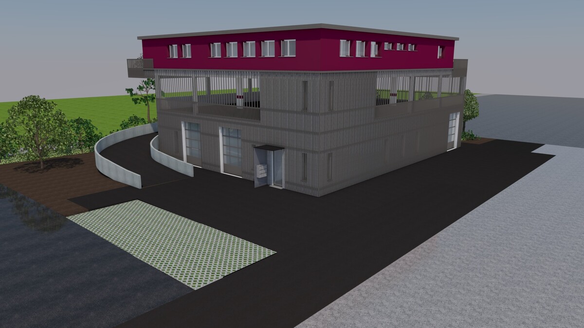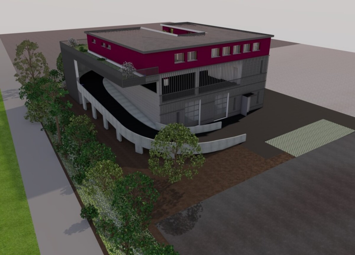 Während der 6-wöchigen Erarbeitung der Diplomarbeit entwickelte sich ein Gewerbegebäude mit vier verschieden grossen Gewerbeflächen. Die besondere Herausforderung dieser Arbeit war die Wiederverwendung aller Elemente des bestehenden Holzpavillons, wobei diese neu geordnet und im 2. Obergeschoss platziert wurden, sowie die Planung eines Parkdecks im 1. Obergeschoss.