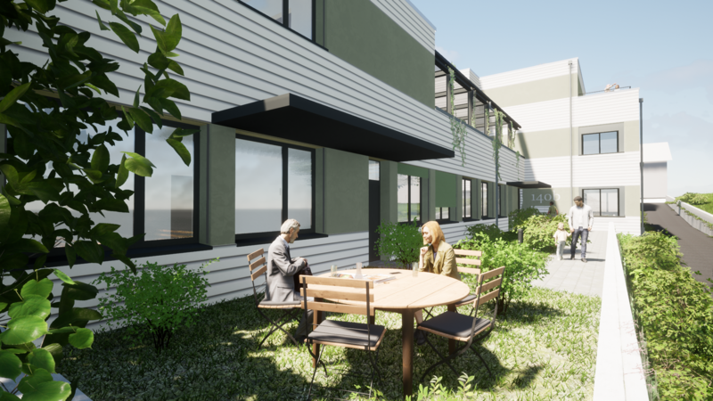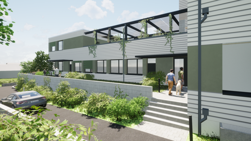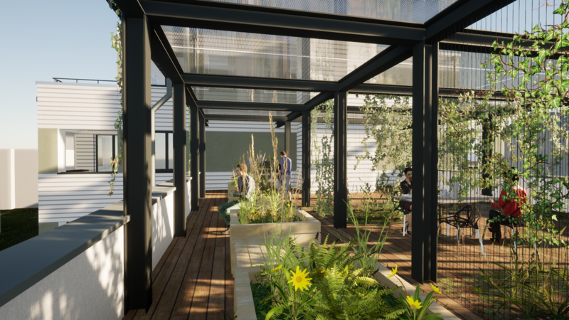 Jede Wohnung verfügt mindestens über eine süd- oder west-orientierte Loggia. Die beiden Erdgeschoss-Wohnungen im Längsbau gelangen über eine Begegnungszone zu ihren Hauseingängen und Vorplatz-Bereichen. Im Obergeschoss soll eine Dachterrasse entstehen, welche für urban gardening genutzt werden kann. Um dem Grünziffer-Anteil (40%) in der Umgebungsfläche gerecht werden zu können, wird die Pergola zudem als Gemeinschaftraum und Treffpunkt für Jung und Alt genutzt. Hochbeete können von den Bewohnern individuell bepflanzt werden. Tische und Bänke laden zum Verweilen ein.