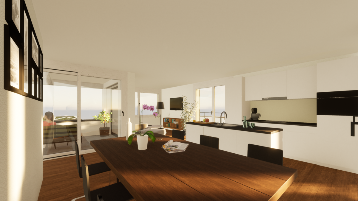 Um der bestehenden und interessanten Struktur gerecht werden zu können, wurde bei den Innenräumen gezielt das bestehende Stützen- und Trägerraster beibehalten. Sämtliche Wohn- und Essräume sind südwestlich orientiert und sorgen für ein lichtdurchflutetes Wohngefühl. Jede Wohnung verfügt über zwei Nasszellen inkl. Waschmaschine und Tumbler. Die Aufstockung im Längsbau wird in Holz-Elementbau ausgeführt und übernimmt die bestehende Skelett-Struktur vom unteren Geschoss. Der Kopfbau wird mit einem BGF-freien Attikageschoss ergänzt. Eine mit Weitblick und dreiseitiger Terrasse ausgestattete 4.5-Zimmerwohnung bildet den Abschluss der acht Einheiten.