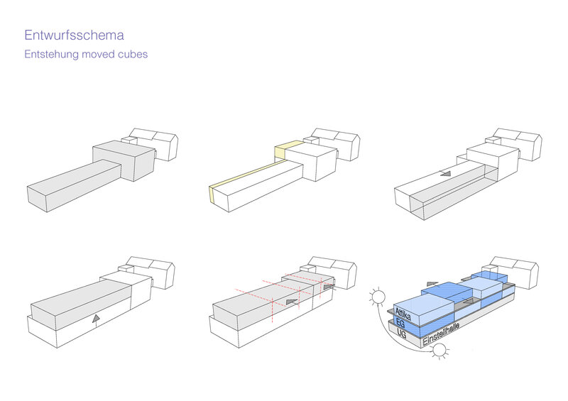 Das Projektkonzept "moved cubes" sieht vor, die Tragstruktur der bestehenden Gewerbehalle zu übernehmen, zu erweitern und zum Wohnraum umzugestalten. Der bestehende Bau wird gegen Westen geöffnet, zum Osten hin vergrössert und um ein Attikageschoss aufgestockt.