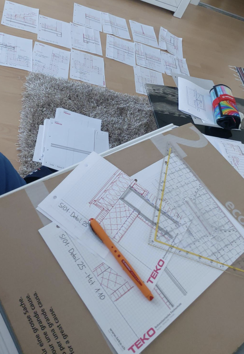 Die Tragstruktur sowie Hourdisdecken habe ich so belassen und brandschutztechnisch mit Mineralwolle eingepackt. Da wir über das grosszügige Raumhöhen verfügen, werde ich einen Doppelboden/ Hohlboden erstellen und dort mit sämtlichen Installationen fahren. Die Hohlräume werden mit Steinwolle ausgedämmt. Im südlichen Anbau werde ich die H-Träger mit Holzaussteifungen verstärken und mit Mineralwolle ausdämmen. Die Aussteifungen verstärken die Tragstruktur und die Erdbebensicherheit. Zudem schafft es eine saubere Grundlage um Fenster aussenbündig anzubringen und entsprechend abzudichten. Der Dämmperimeter ist somit durchgehend.