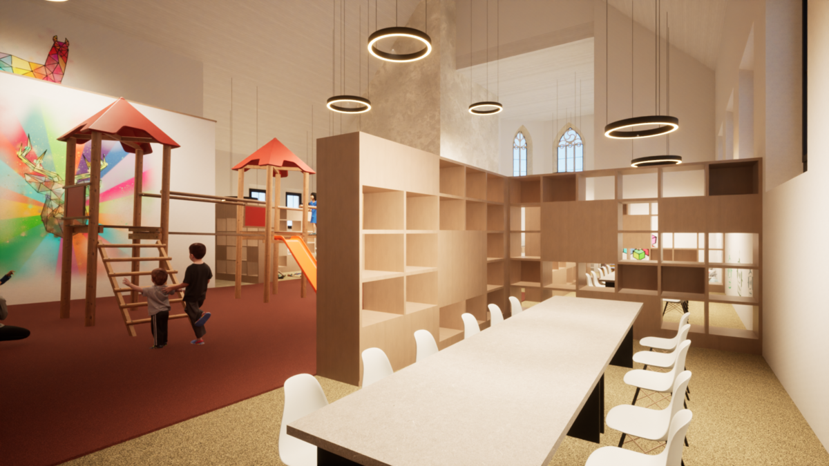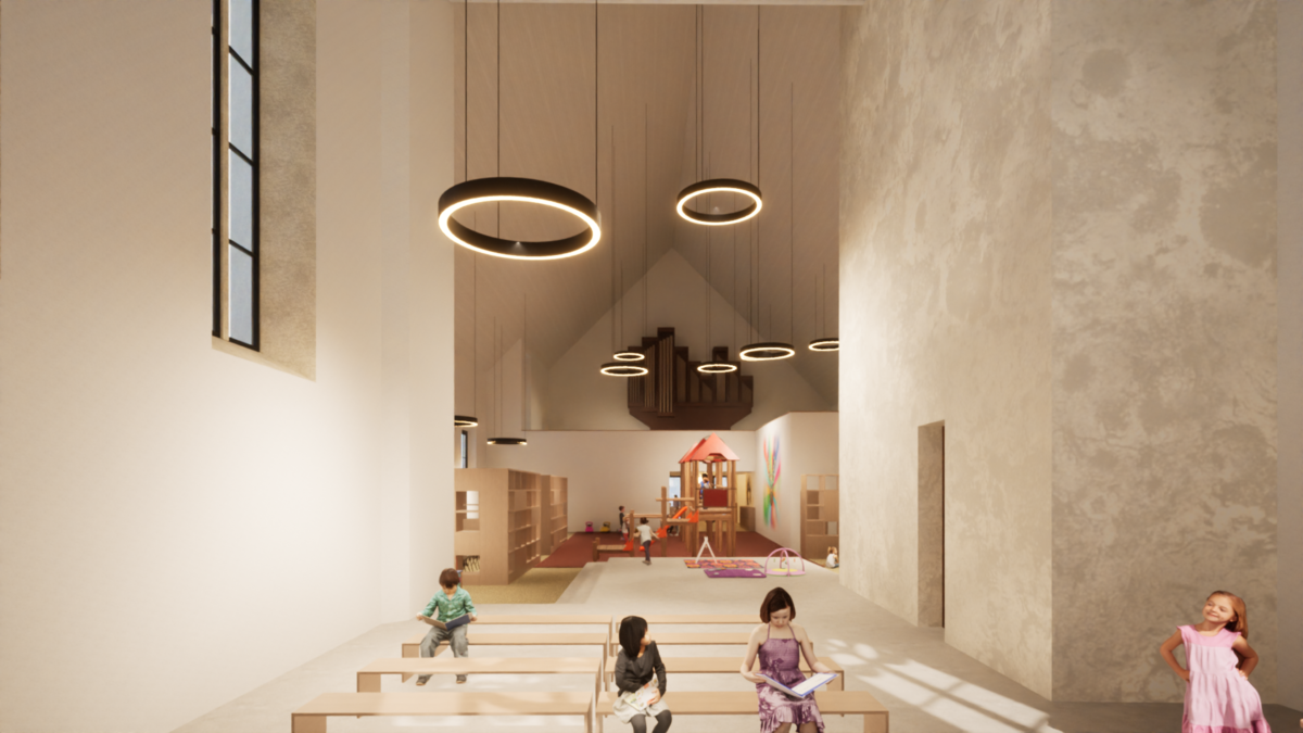 Im Kircheninnern sollen alle benötigten Räume für eine Kindertagesstätte ihren Platz finden. Im Erdgeschoss bleiben die Eingang erhalten und führen direkt zu den Nasszellen und Garderoben. Im Hauptschiff sollen alle Spiel- und Bastelräume ihren Platz finden. Der Minestrantenraum soll zu einer grossen Küche umgebaut werden. Der Chor soll nur durch neue Bänke zu einem Theater- und Geschichtenspielplatz ergänzt werden.