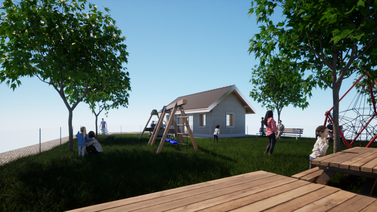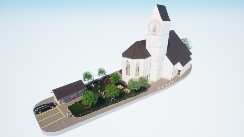 Im Aussenbereich soll ein kleines, unbeheiztes Lagerhäuschen für die Aussenspielgeräte entstehen. Dies ist in der Verlängerung der Südwestfassade angesiedelt. Der Hauptteil es Platzes östlich des Chors, soll zu einem Aussenspielplatz mit Schaukeln, Klettergerüst und Sitzmöglichkeiten ausgebaut werden.