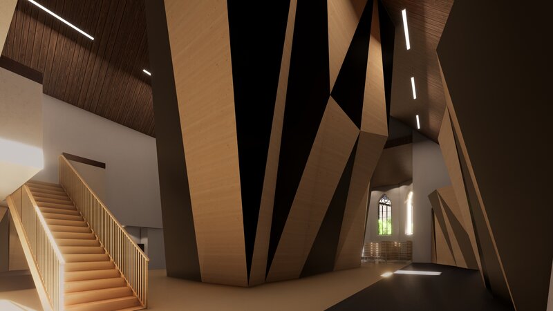 Statuen im Kirchenschiff werden als Leihgabe an andere Kirchen weitergegeben, ausser denen im Chor, die als Dekorationsaccessoire an ihrem Platz verbleiben. Zusätzlich zur Kletterhalle entsteht auf dem Kirchenvorplatz ein 170 m² grosser Pavillon, in dem ein Bistro für Kletterer und Nicht-Kletterer eingerichtet wird. Dazu wird ein kleines Büro für die Verwaltung der Halle und ein Schulungsraum integriert, in dem Hobby- und Berufskletterer ihre Kurse abhalten können.