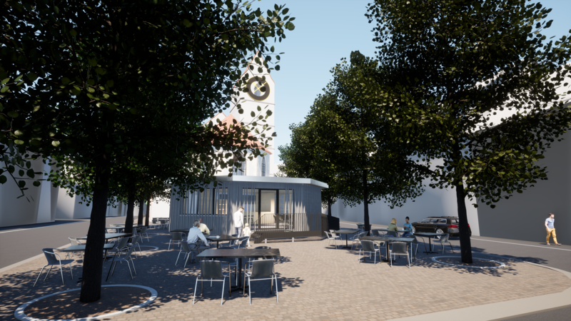 Durch den neuen Cafépavillon auf dem östlichen Vorplatz der Kirche und den neuen einladenden Sitzplätzen im Schatten der bereits heute bestehenden Bäumen, wird dem Städtli neues Leben eingehaucht. Es entsteht ein Treffpunkt für die Gemeinde, bei dem sich jeder willkommen fühlen soll. Der Pavillon bietet im Innern zusätzlich die Produkte der Bauern aus der Umgebung zum Kauf an.