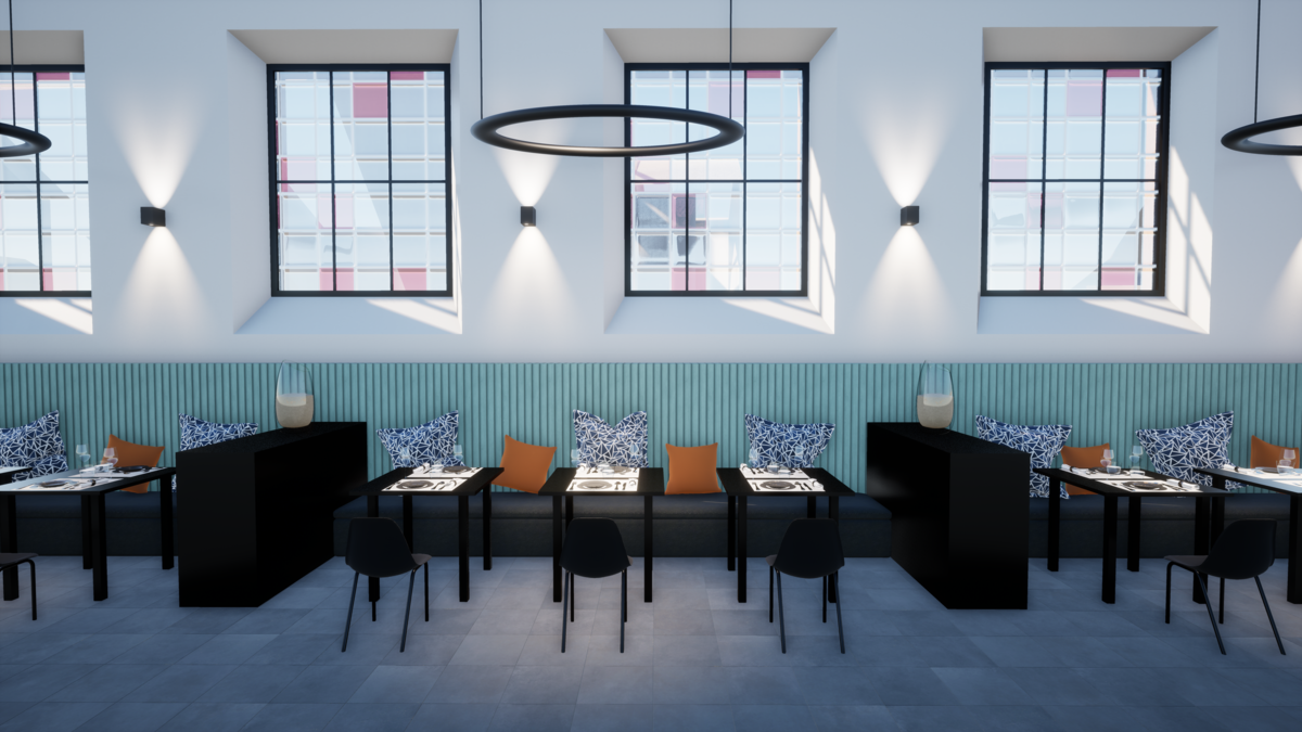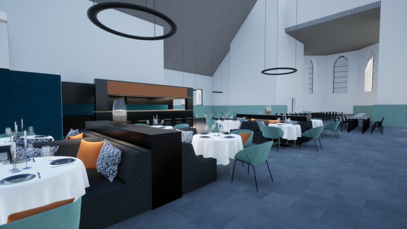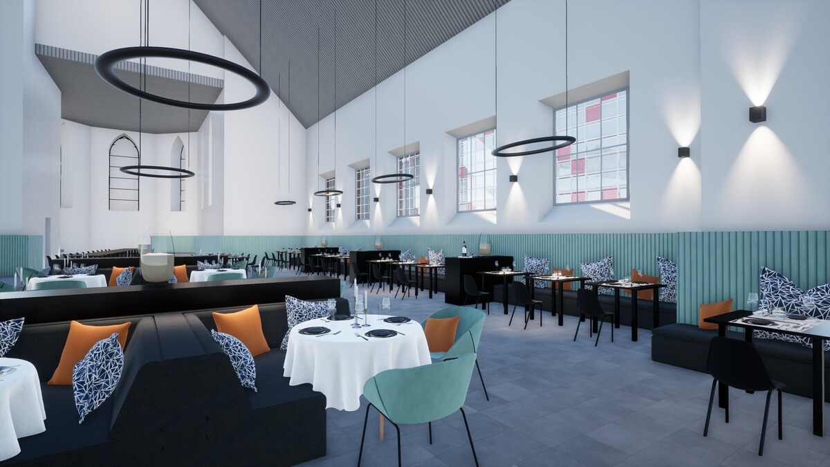 Die Kirche wird in ein modernes und elegantes Restaurant umfunktioniert. Die Gebäudehülle bleibt unverändert bestehen. Die neuen Innen Kubaturen heben sich in Ihrer Farb- und Material Wahl klar vom Bestand ab. Diese wirken "eingeschoben", so dass der Besucher Bestand und Neu einfach unterscheiden kann. Durch die flexible Bestuhlungsmöglichkeit des Speisesaales, kann das Restaurant auch als Eventlokal gemietet werden. Mit der einzigartigen Atmosphäre im Innern und dem leckeren Essen sollen Auswärtige in die Stadt gelockt werden.