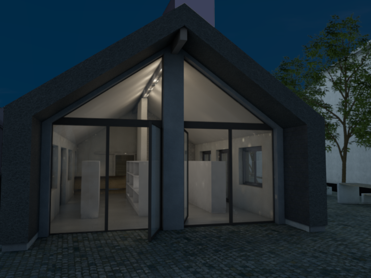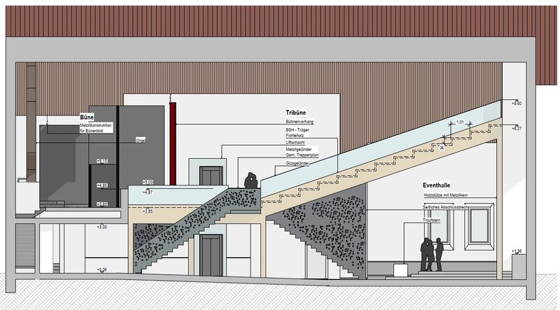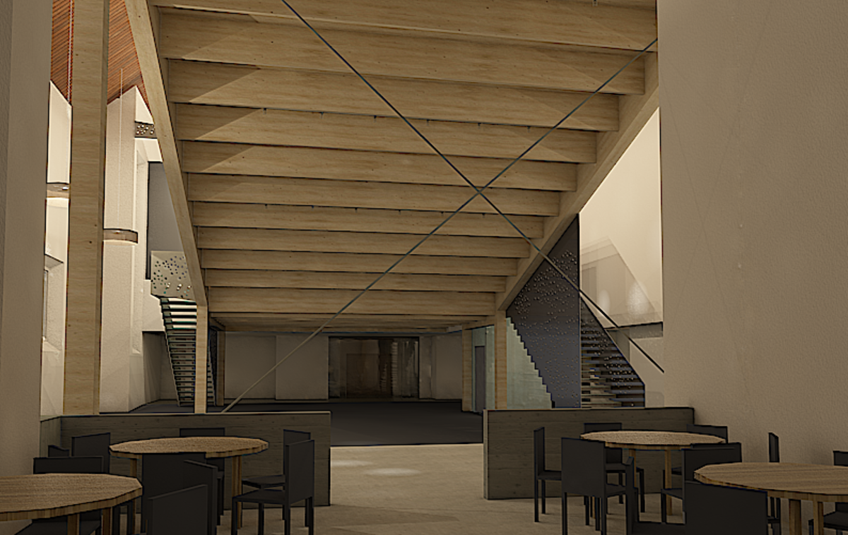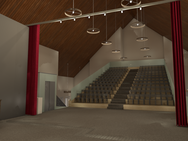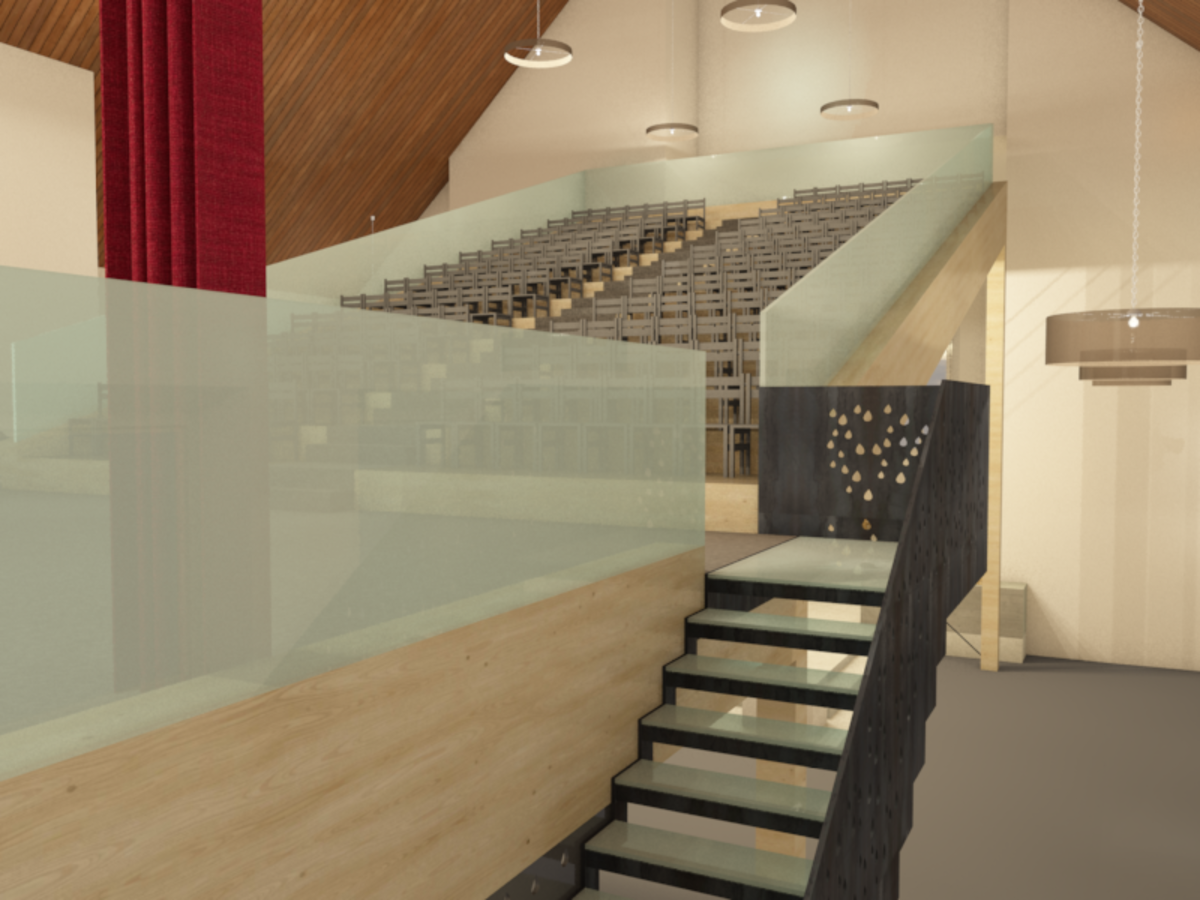 Meine Grundidee besteht darin, eine Eventhalle mit Bezug zur Kultur zu schaffen. Aus einer Holzkonstruktion wird eine Erweiterung der Empore als Bühne/ Tribüne erschaffen, um Vorstellungen wie ein Theater aufführen zu können. Darunter soll eine Art Markthalle und Ausstellungsraum verwirklicht werden. Die Tribüne soll an eine Welle erinnern, die durch die ganze Kirche strömt und den Fluss des Lebens widerspiegelt.