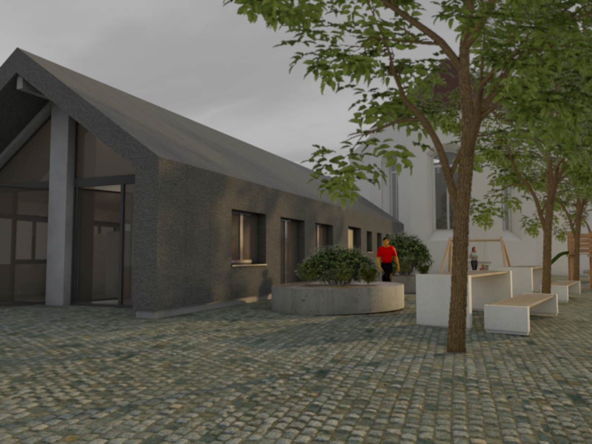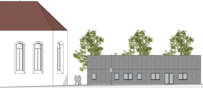 Der Neubau soll abstrakt erscheinen, sodass er trotz seiner spannenden Fassade neben der imposanten Kirche in den Hintergrund rückt. Die Ausrichtung des Grundrisses soll im «Fluss» der Kirche sein, so dass keine strenge Linie zwischen Neubau und Kirche entsteht.