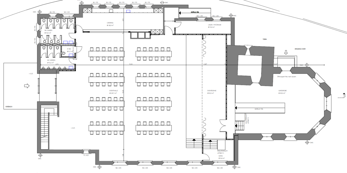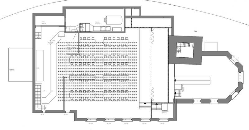 In der Kirche ist eine Eventhalle eingeplant. In welcher man Vorführungen, Vorträge oder Feiern absolvieren kann. Mit verschiedenen Bestuhlungsarten kann man unterschiedlich vielen Personen Sitzgelegenheiten bieten. In der Kirche gibt es einen kleinen Catering Bereich, in welchem man Speisen zubereiten kann. Es gibt neue getrennte WC-Anlagen und ein IV WC. Als Hauptattraktion ist eine Eventbühne eingeplant. Die Empore ist für die Öffentlichkeit nicht zugänglich und wird für die Bühnentechnik verwendet.