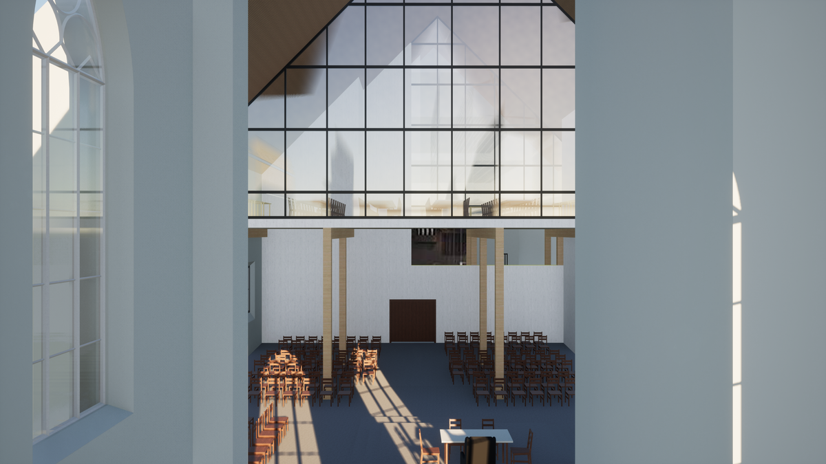 Aus der bestehenden traditionellen Kirche wurde ein Eventgebäude, in welchem man Hochzeiten, Büroanlässe oder sonstige Events durchführen kann. Die bestehenden Kirchenmauern dürfen nicht verändert werden. Ein späterer Rückbau zu der ursprünglichen Kirche muss möglich sein. Für den Umbau des Innern wurde ein Holzständerbau gewählt. Mit den trockenen Elementen können die statischen- , brandschutztechnischen- sowie auch die akkustischen Anforderungen eingehalten werden. Der Neubau, ein kleines Kaffe, wird in Holzelementbau ausgeführt, um eine kürzere Bauzeit mitten im Stadtzentrum zu gewährleisten.