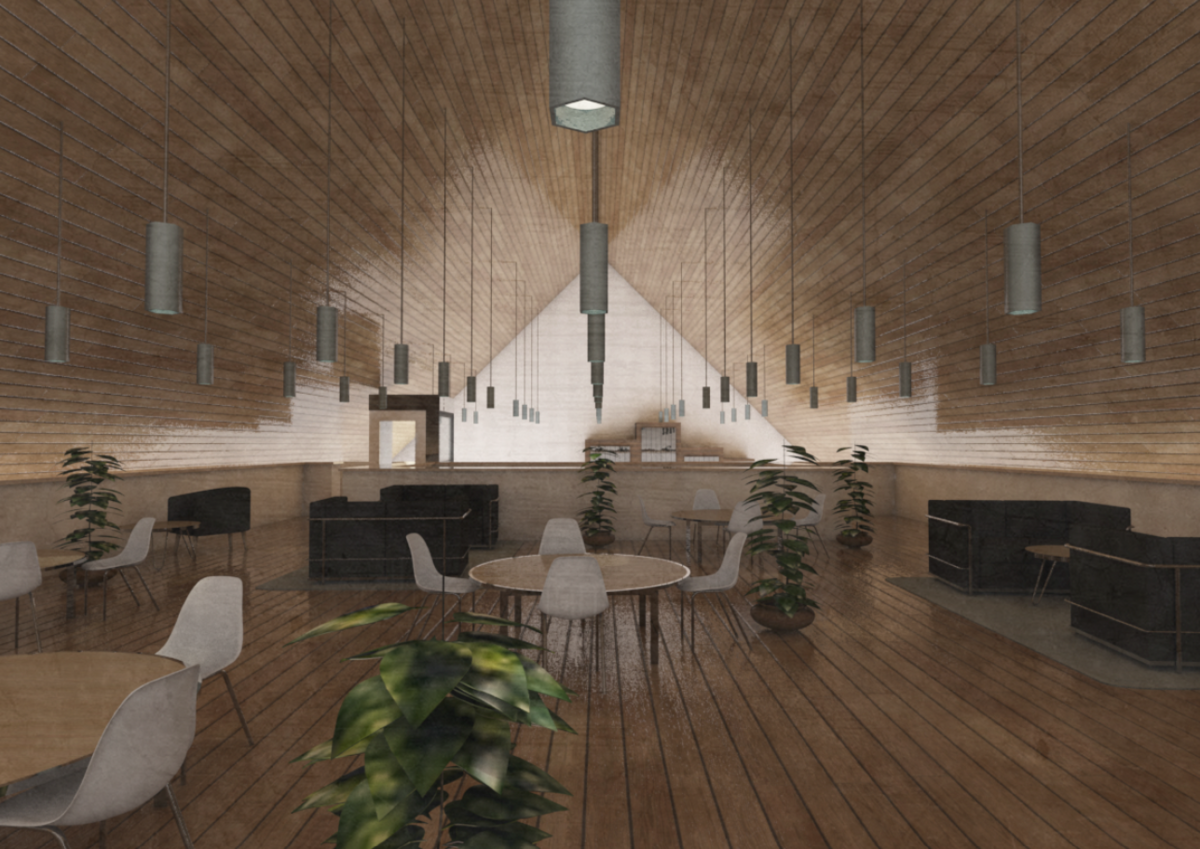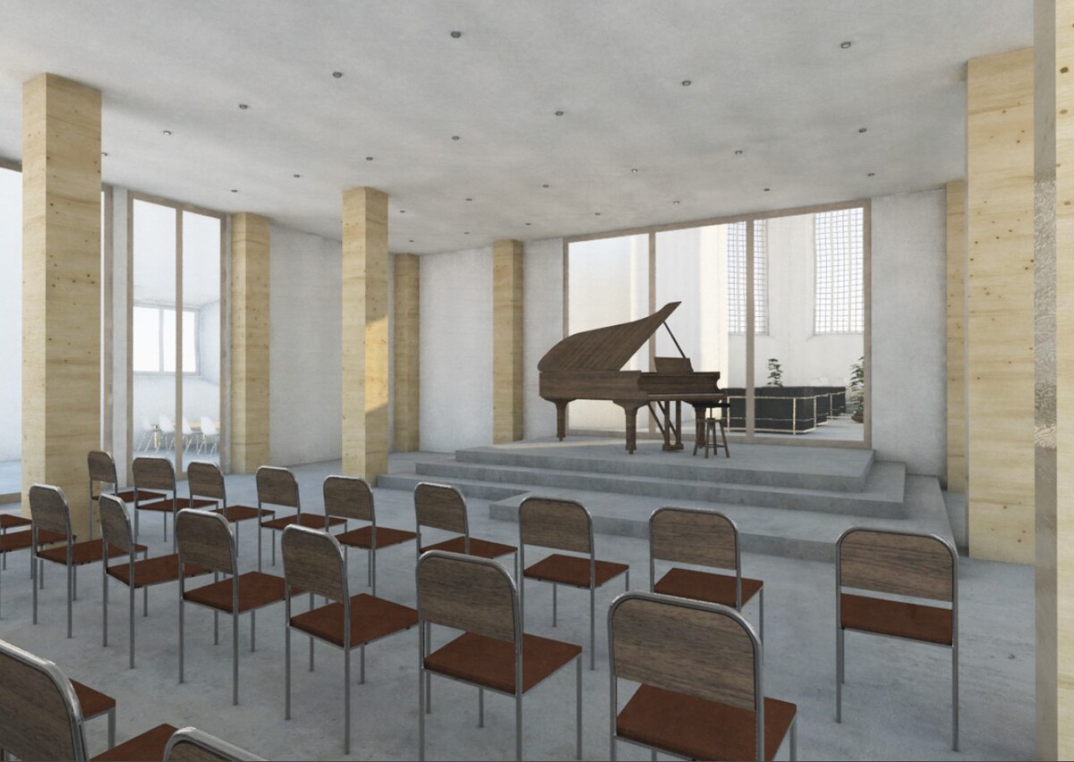 Auf dem derzeitigen Parkplatz wird ein Massivbau von etwa 45m2 errichtet, der als Bistro genutzt wird. Zusätzlich gehört zu diesem Gebäude eine Aussenfläche von rund 20m2. Der Neubau ist separat von der Kirche erschlossen und bietet völlige Unabhängigkeit. Ebenso wie das Hauptgebäude wird auch dieser Neubau möbliert zur Pacht angeboten.