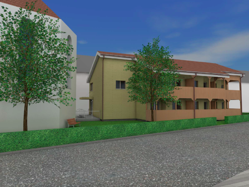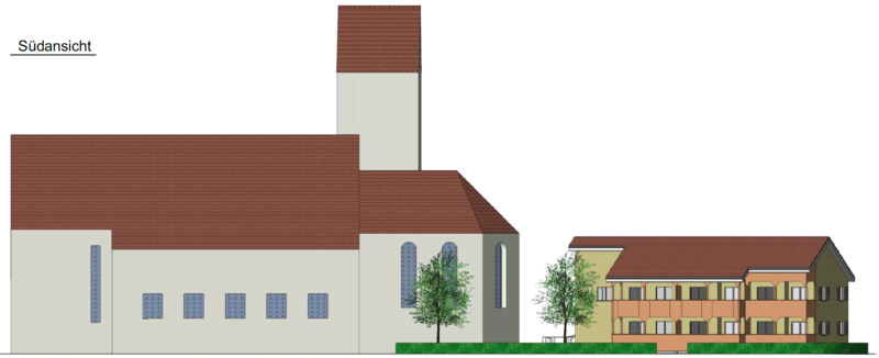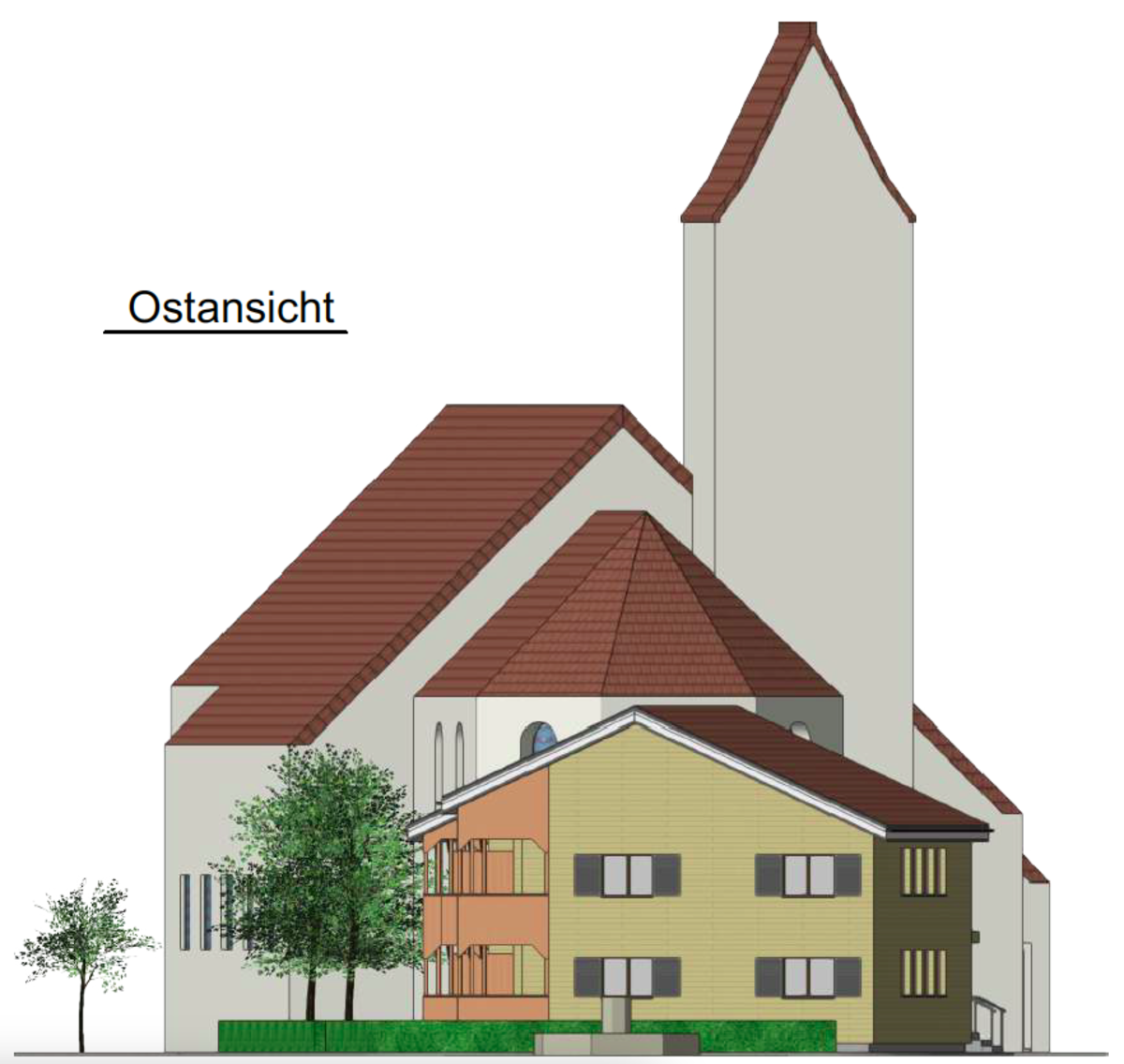 Zusätzlich zur inneren Nutzungsänderung ist auf der Parzelle Nr. 1089 ein neuer Hochbau im Aussenbereich zu Planen, dessen Nutzung in direktem Zusammenhang mit der neuen Innennutzung der Kirche stehen muss.