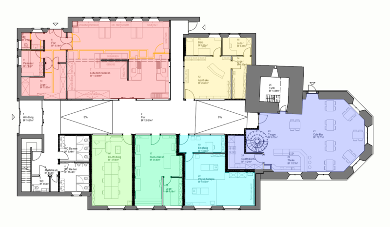 Auf Grundlage der Marktanalyse entstand die Idee, ein kompaktes Zentrum mit verschiedenen grundlegende Dienstleistungsbetrieben in der Kirche zu schaffen, in dem die menschen nahe ihrer Haustür die wichtigsten Bedürfnisse abdecken können. Zusätzlich wird hinter der Kirche eine Neubau mit barrierefreie Wohnungen für ältere Menschen erstellt.
