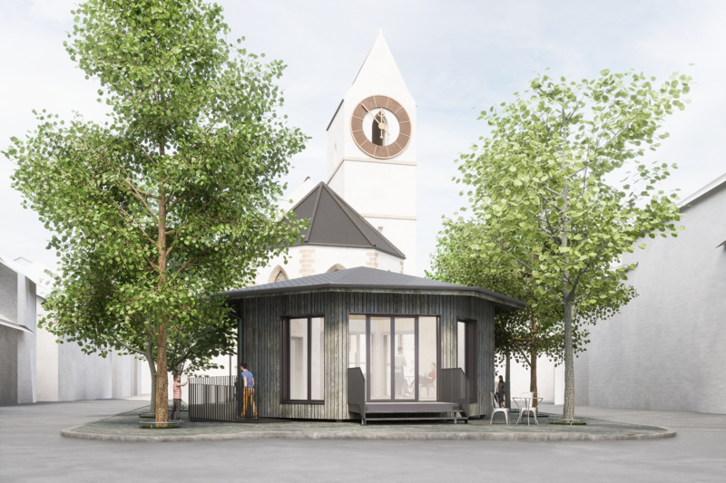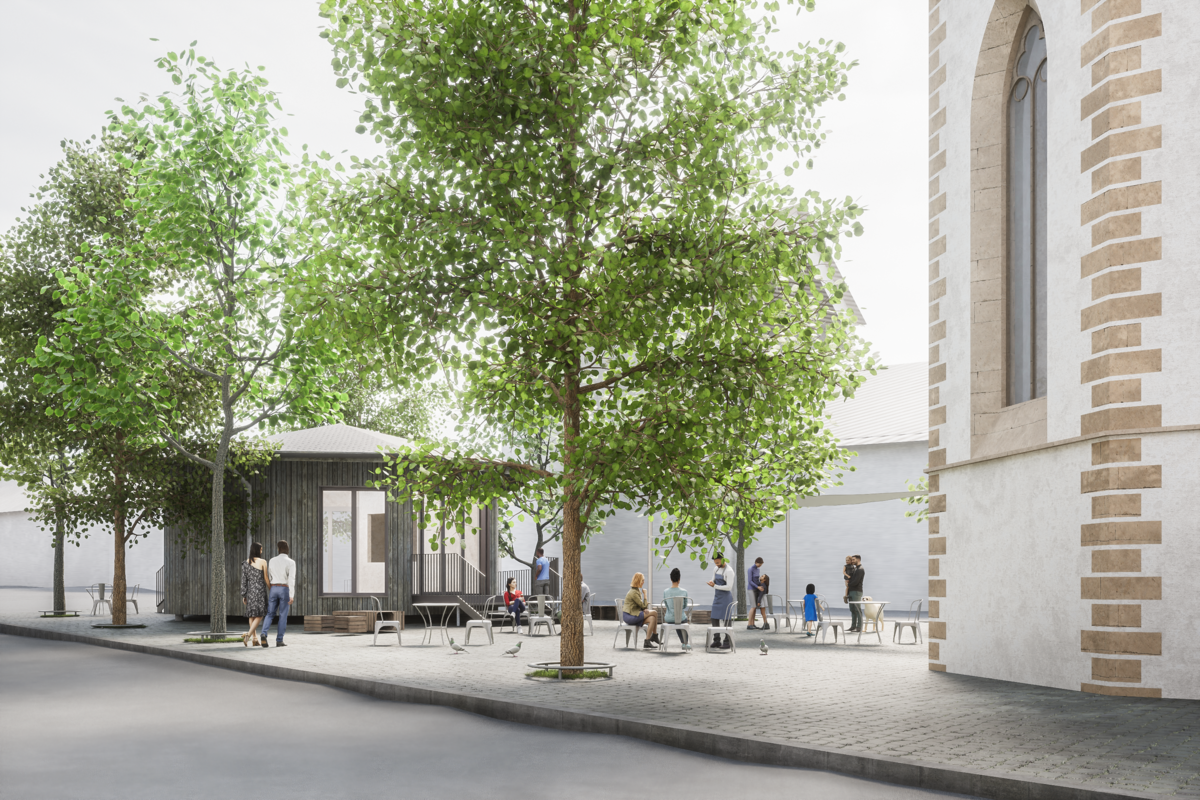 Östlich der Kirche entsteht eine neue Kaffeebar mit einem Aussenbereich für Gäste. Das Gebäude ist eingeschossig und verfügt über eine kleine Bar im Innenbereich. Die Lage des Neubaus wurde so gewählt, dass ein Innenhof entsteht, und für die Fassade ist eine vertikale Holzverkleidung vorgesehen.