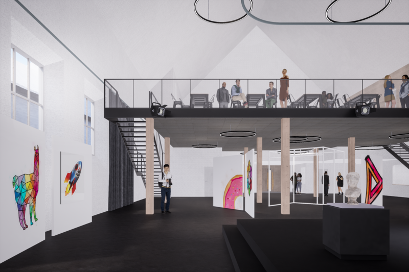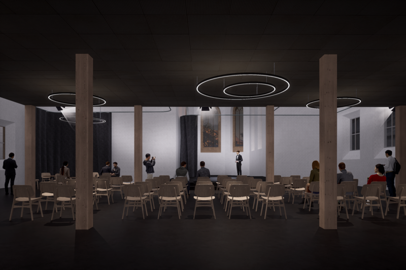 Durch die Übernahme und Umgestaltung der bestehenden Kirche wird aus einem ehemals kirchlichen Gebäude eine multifunktionale Halle mit einer Aussenkaffeebar geschaffen. Die Marktanalyse zeigte, dass vor allem Bedarf an Räumlichkeiten für verschiedene Veranstaltungen besteht, und dies spiegelt sich in der Planung wider. Dafür wird die Kirche im Innenraum mit einer Zwischendecke ausgestattet, die das Obergeschoss bilden wird. Der Boden im Erdgeschoss wird geebnet und zusammen mit der neuen Bühne entsteht so eine Mehrzweckhalle mit vielfältigen Nutzungsmöglichkeiten.