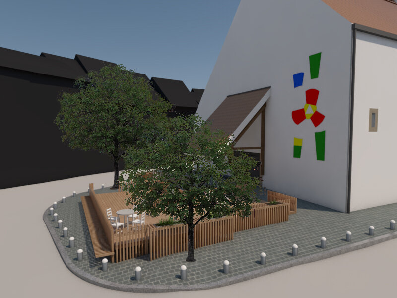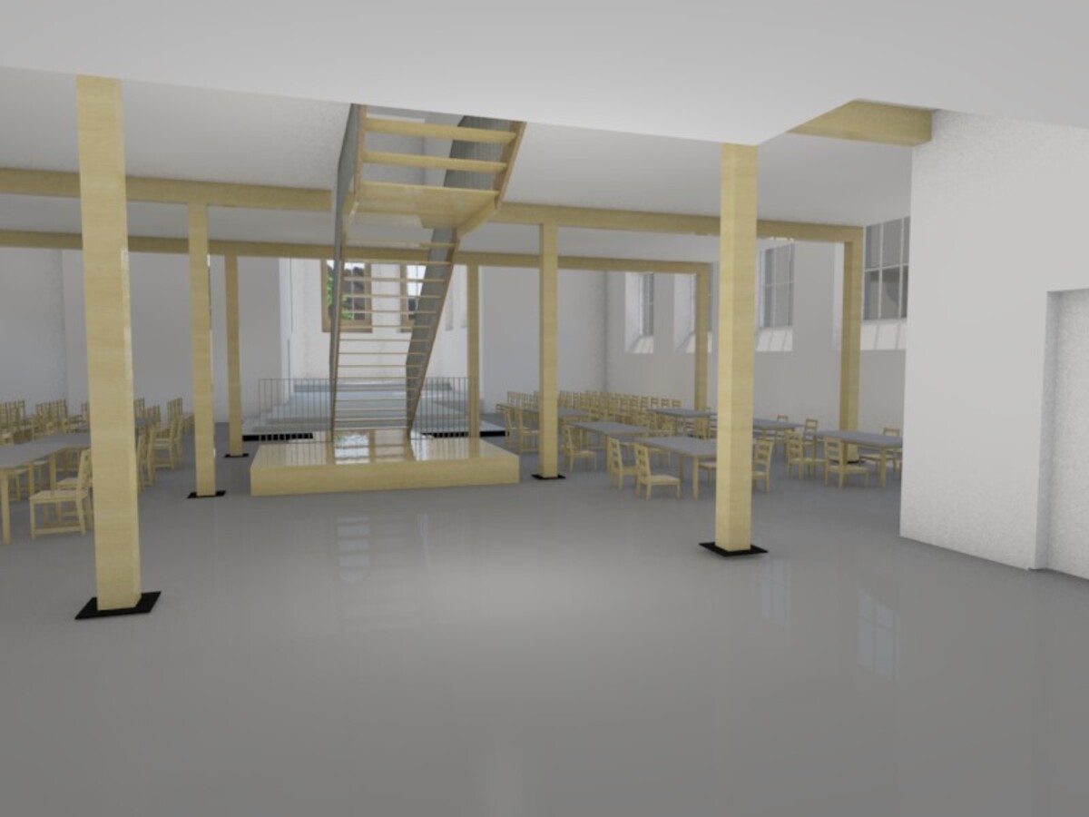 Im Erdgeschoss entsteht eine Bar inklusive Bistro und lädt zum Verweilen ein. Im hinteren Teil der ehemaligen Kirche wird eine Mehrzweckfläche mit kleiner Bühne beibehalten. Dieser Mehrzweckbereich kann mit Vorhängen vom Bistro abgetrennt werden. Der Aussenraum vor dem Haupteingang wird zu einem zentralen Ort der Begegnung mit einem erhöhten möblierten Aussensitzplatz aus Holz. Dieser kann im Sommer aber auch in den kühleren Jahreszeiten genutzt werden, sei es für das Geniessen von kühlen Drinks oder warmem Glühwein. Am Standort des ehemaligen Parkplatzes im östlichen Bereich wird ein geschlossener Pavillon aus Holz erstellt, welcher den Einwohnern zur Verfügung gestellt wird und für private Anlässe gemietet werden kann.