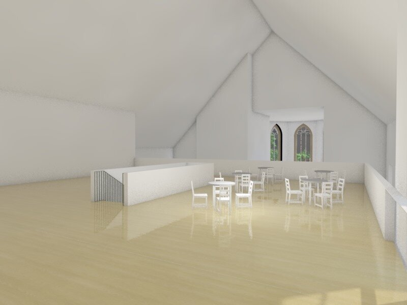 Über eine im Erdgeschoss zentrale angeordnete Treppen erreicht man das Obergeschoss der Kirche, wo die ehemalige Tribüne und der Chor Platz gefunden haben. Dort entsteht eine vergrösserte Ausstellungs- bzw. Nutzfläche, auf welcher beispielweise Märkte oder Bilderausstellungen stattfinden können. Der Technikraum inklusive Vorraum im Obergeschoss wird nicht verändert und bleibt in der Form bestehen.