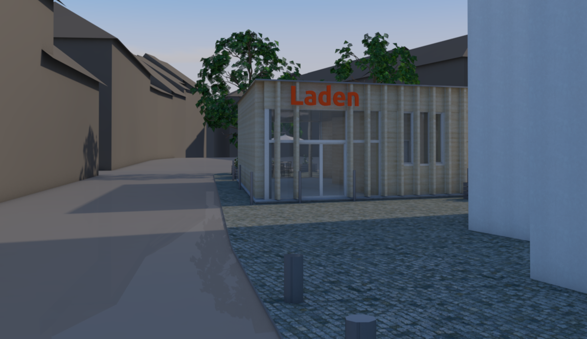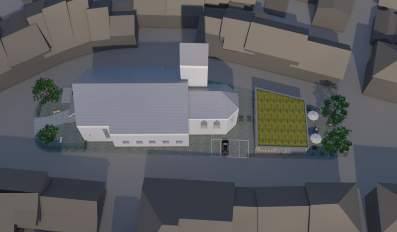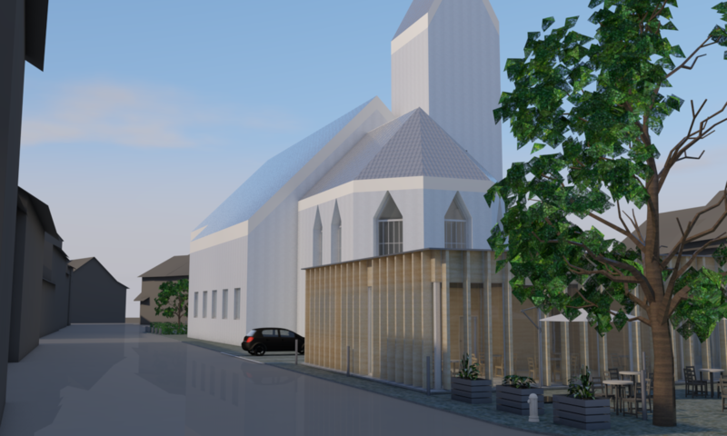 Der geplante Pavillon auf dem Kirchenvorplatz wird einen Lebensmittelverkaufsladen und ein Café beherbergen. Der Parkplatz wird dafür gerodet. Der Lebensmittelverkaufsladen bietet großzügige Verkaufsflächen und ein Café mit zentraler Theke, Sitzbereich, separaten Toiletten und einer gut ausgestatteten Küche. Das Café verfügt über eine große Außenfläche für Freiluftspeisen und Entspannung.