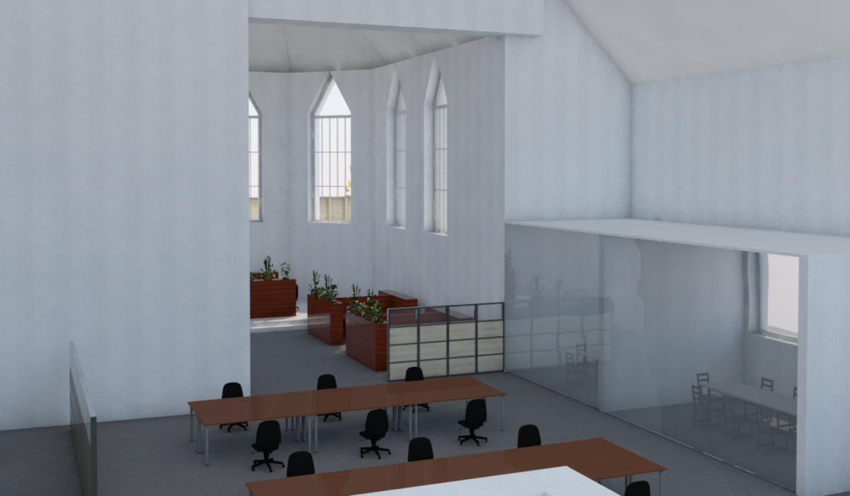 Die Kirchenrenovierung zielt darauf ab, den Innenraum an die Bedürfnisse eines Coworking Spaces anzupassen, wobei die historische Pracht erhalten bleibt. Maßnahmen umfassen die Entfernung von Kirchenbänken, die Verlegung eines neuen Bodens, Verbesserung der Akustik, Erneuerung der Sanitäranlagen und die Schaffung eines modernen Coworking Spaces mit flexiblen Arbeitsplätzen und einem sozialen Aufenthaltsraum für Veranstaltungen.