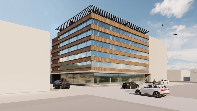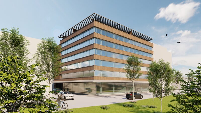 Die neuen Hauptfassaden spiegeln die Nachhaltigkeit des Gebäudes über die Holzlamellen der Brüstungsbänder wieder. Die Fassade ist nicht nur optisch ansprechend, auf die Wahl nachhaltiger Dämm- und Dichtstoffe wird grossen wert gelegt. Das Gesamtkonzept soll möglichst ohne grosse Betonierarbeiten auskommen.