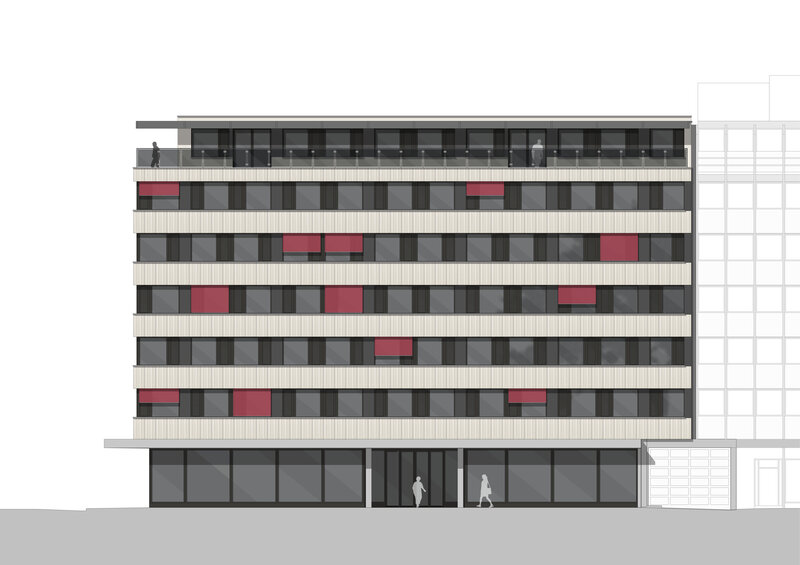 Im Eingangsbereich werden die bestehenden Innenwände durch Glas ersetzt, um mehr Licht in diesen transportieren zu können und dem heutigen «Tunnelcharakter» entgegenzuwirken. Die zwei äusseren Windfänge werden aufgehoben und mit dem mittleren zusammengefasst, so dass die Zugänglichkeit zu sämtlichen Nutzungen über einen zentralen Windfang funktionieren kann. Im Inneren wird ein Rezeptionsmöbel platziert, dass in erster Linie als Empfang für die Gäste des Hotels dienen soll. Gegenüberliegend wird eine perforierte Leitwand in Holzoptik angebracht, welche den Raum trichterförmig ausgestaltet, Besucher aufnimmt und gleichzeitig eine Funktion der Ausschilderung aller Nutzungen im Gebäude übernehmen kann. Die bestehenden Liftanlagen werden ersetzt und einer Nutzungstrennung unterworfen. Der linke Liftschacht soll für alle Besucher der öffentlich zugänglichen Nutzungen, also alle bis auf den Wohnraum im Attikageschoss, nutzbar sein. Der rechte Liftschacht wird mit einem separaten Vorraum abgetrennt und dient ausschliesslich der Erschliessung der Cluster-Wohnungen und des Untergeschosses. Der Vorraum kann unten nur mit einem Schlüssel geöffnet werden, oder aber der Nutzer im 6. Obergeschoss gewährt über die Klingelanlage Einlass in den Vorraum und damit in den Aufzug, welcher direkt bis in die Wohnung führt.