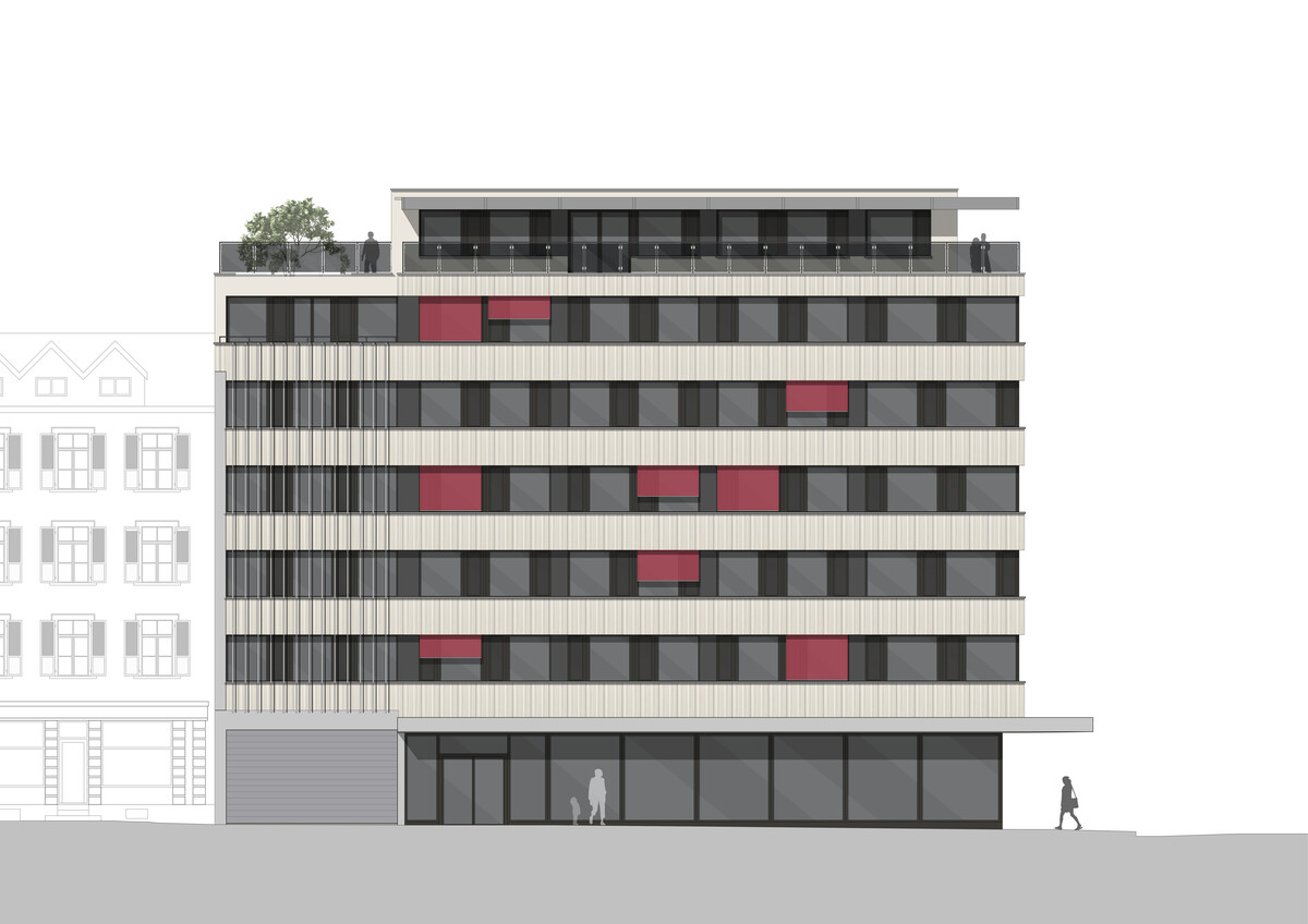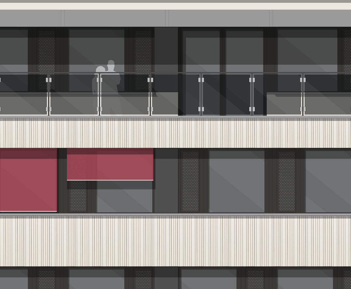 Die bestehende Fassade auf der Südwest- und Nordwestseite wird vollständig abgebrochen. Auf die bestehenden Betondecken wird eine Holzbaukonstruktion aufgesetzt, das Fensterband - und damit die horizontale Betonung der Fassade - wird erhalten. Der Konstruktion wird eine keramische Ziegelfassade vorgehängt, welche mit einer leicht unregelmässigen Struktur daherkommt und mit ihrer Dauerhaftigkeit besticht. Die neu eingebauten Holz-Metall-Fenster kommen aussenseitig in einem edlen Anthrazit-Look daher. Die ursprüngliche Brüstungshöhe wird beibehalten, als Absturzsicherung wird vor jeden Fensterflügel ein Lochblech montiert. Abgerundet wird das bis dahin schlichte Bild durch Fassadenmarkisen in einem kräftigen «rouge vermillon», welches geringfügig an den Farbton des heutigen Fassadenmosaiks erinnern soll. Im Attikageschoss wird anstelle der Keramikfassade eine Eternit-Platte im entsprechenden Farbton vorgehängt. In den Bereichen des ehemaligen Sandwich-Panel-Elements, welches die Fenster unterteilt hat, wird die Holzkonstruktion der Brüstung zurückversetzt bis an die Decke durchgezogen und aussen mit einer anthraziten Eternit-Platte bekleidet, so dass das Fensterband optisch nicht unterbrochen wird. Die Fassaden gegen den Innenhof werden lediglich mit einer verputzten Aussenwärmedämmung aufgedoppelt, um den gesetzlich geforderten U-Wert zu erreichen. Einige Fensteröffnungen werden in Ihrer Anordnung und Dimension auf die neu einquartierten Nutzungen angepasst.