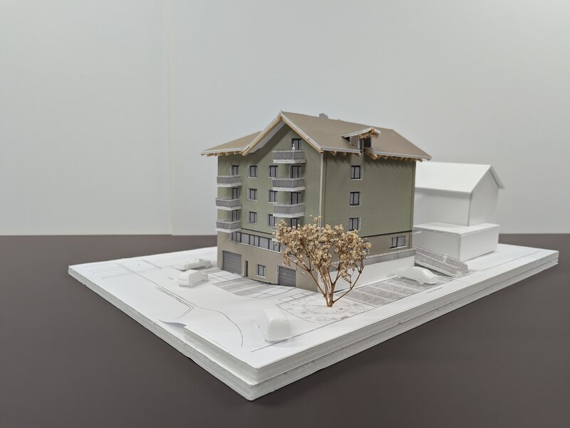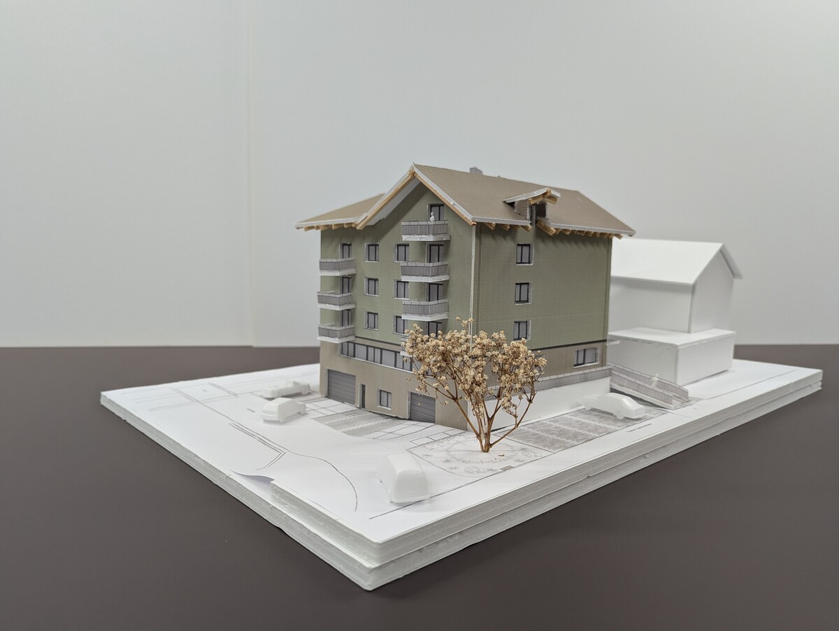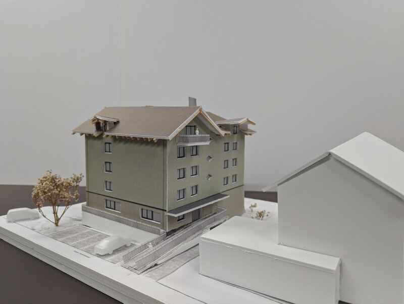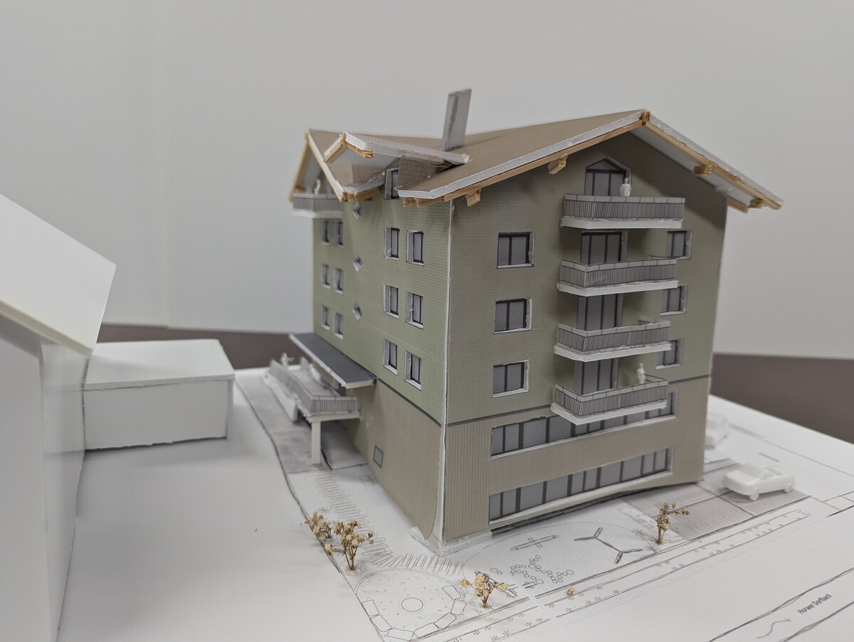 Da sich im Erdgeschoss diverse Nutzungen ansiedeln sollen, wird es in zwei Geschosse aufgeteilt. Im EG0 finden sich die Einstellhalle und Autolackierwerkstatt ein, während die darüberliegende Fläche für die Töpferei / Kreativwerkstatt vorgesehen ist. Eine klare Trennung, die auch in der Fassade sichtbar wird, trennt die Obergeschosse Wohnen vom Gewerberaum im Erdgeschoss. Das projektierte Steildach fügt sich harmonisch in die Umgebung ein. Die Hauptfirstrichtung verläuft, wie bei den meisten umliegenden Gebäuden Richtung Pilatus. Der Entscheid für ein Steildach wurde auch im Hinblick auf die Ausnützung des Bauvolumens getroffen. Denn die Bauvorschriften erlauben hiermit eine höhere Bebauung und durch eine geschickte Anordnung der Dachfläche, kann mehr Wohnraum geschaffen werden. Mit den zwei Firstrichtungen, die in T-Form verlaufen, wird die vermietbare Fläche im Dachgeschoss bis auf 7m2 nutzbar gemacht.