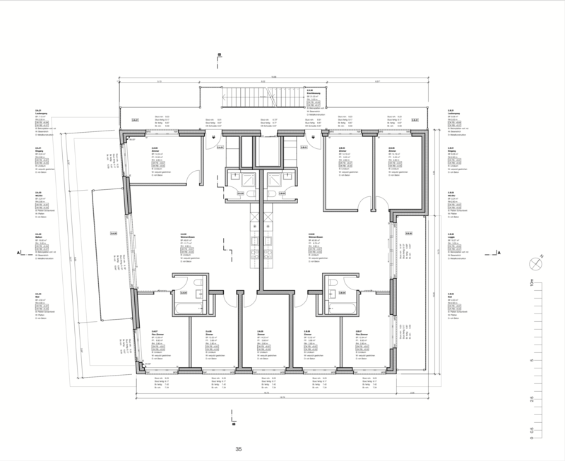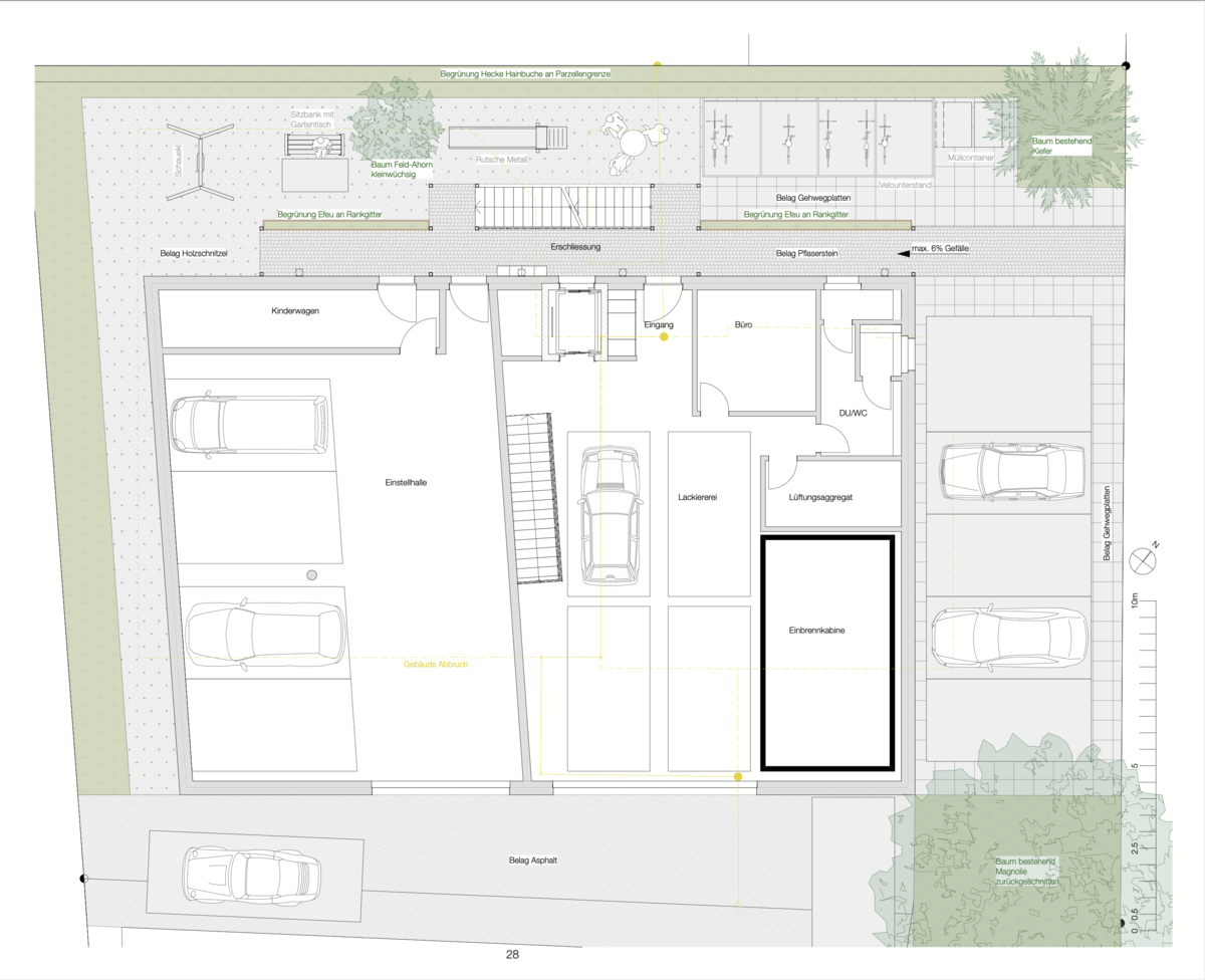 Es sollte ein Renditeobjekt in Form eines MFH erarbeitet werden, mit einer Autolackiererei und der Einstellhalle im Erdgeschoss sowie Wohngeschossen darüber.