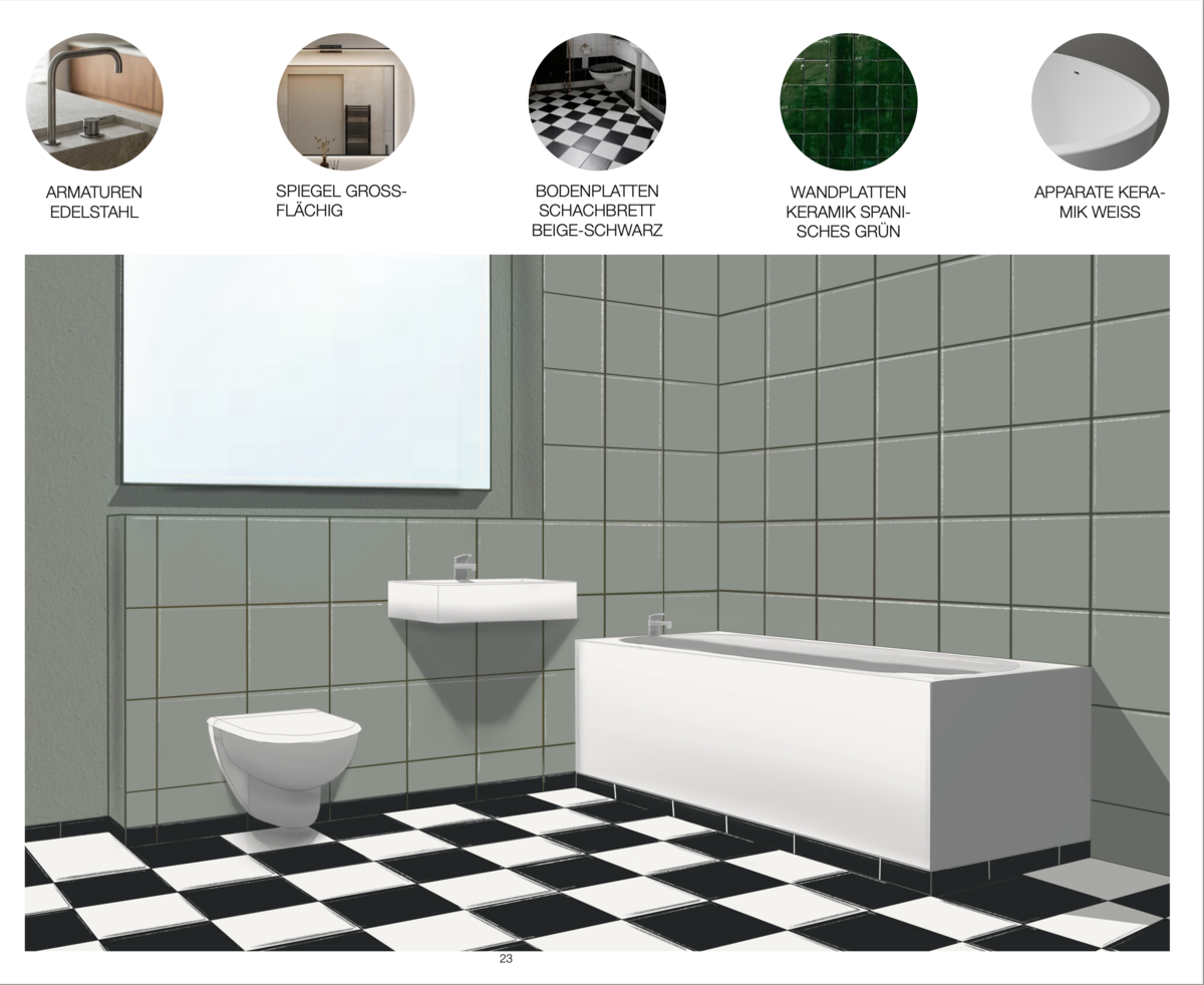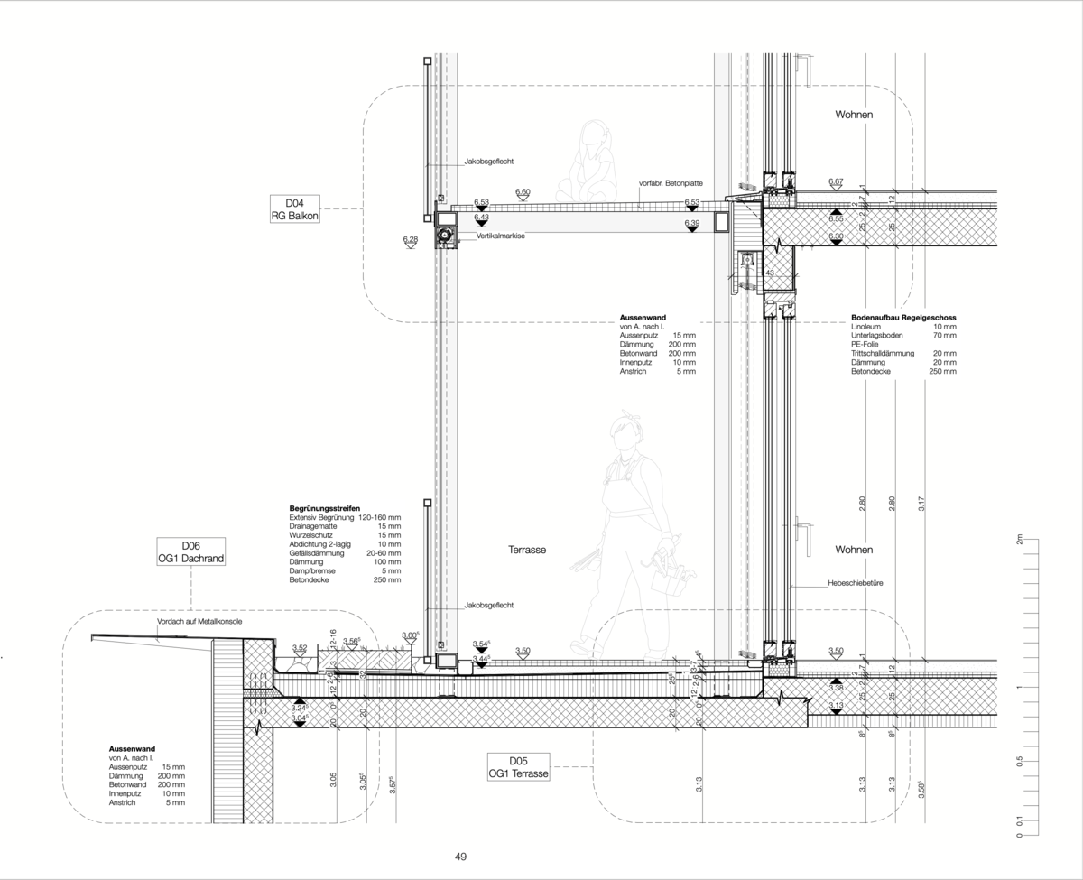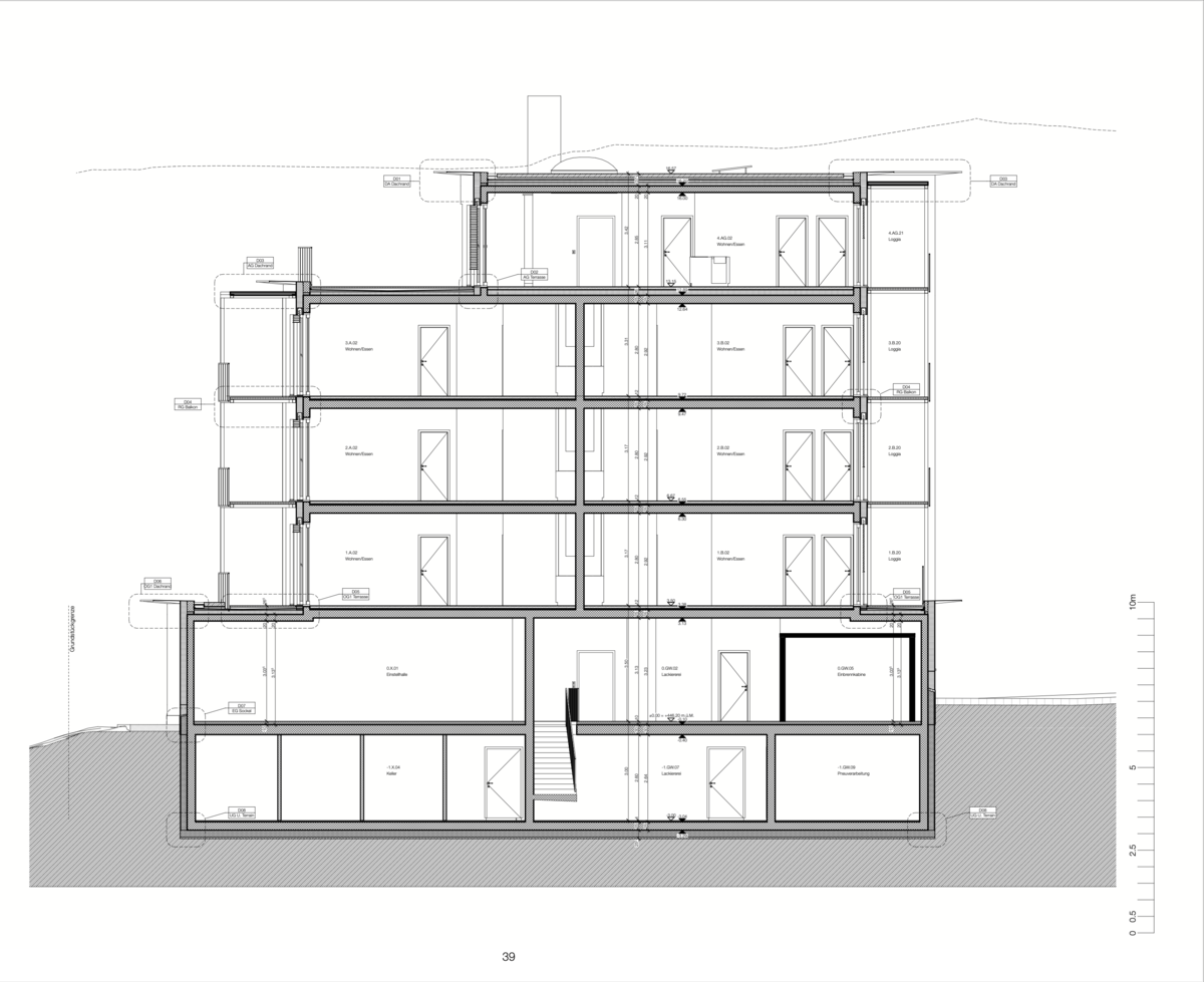 Ich habe ein Massivbau mit einem Unter-, vier Voll und einem Attikageschoss entworfen. In den drei Regelgeschossen sind jeweils zwei 5.5 Zimmer Wohnungen, für die Eigentümer:in ist die Attikawohnung vorgesehen.