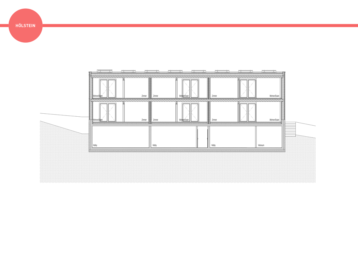 Das Projekt setzt sich aus vier gleichen Baukörper zusammen, welche jeweils über Laubengänge erschlossen werden. Zwei Häuser sind mit einer Einstellhalle verbunden. Die zwei anderen Häuser bieten grössere Hobbyräume im Sockelgeschoss.