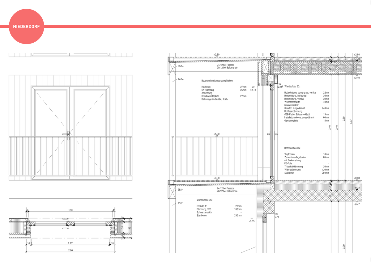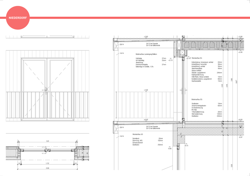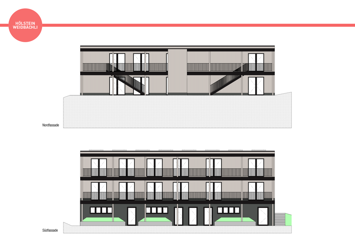 Die Konstruktion der Häuser ist identisch. Das Untergeschoss soll betoniert werden und darauf soll ein Holzelementbau gestellt werden. Die Laubengänge und Balkone werden als Holzskelett-Konstruktion mit geschlossenen Decken erstellt.