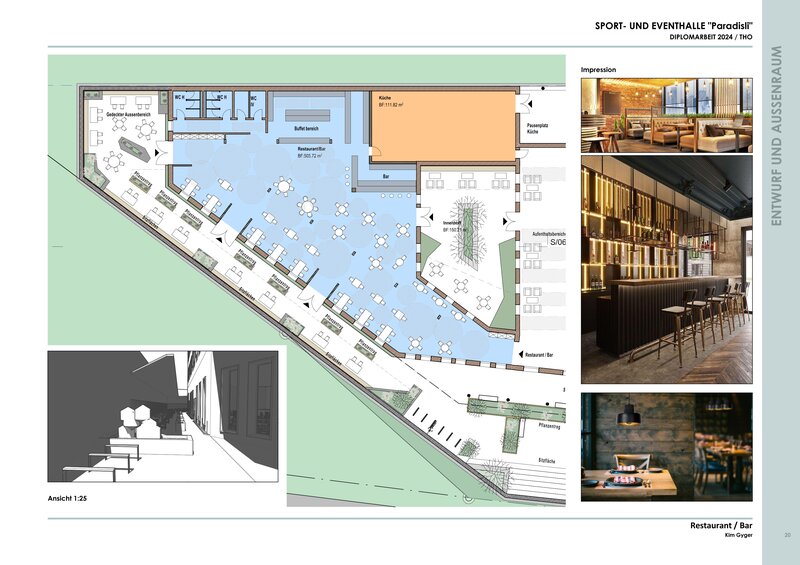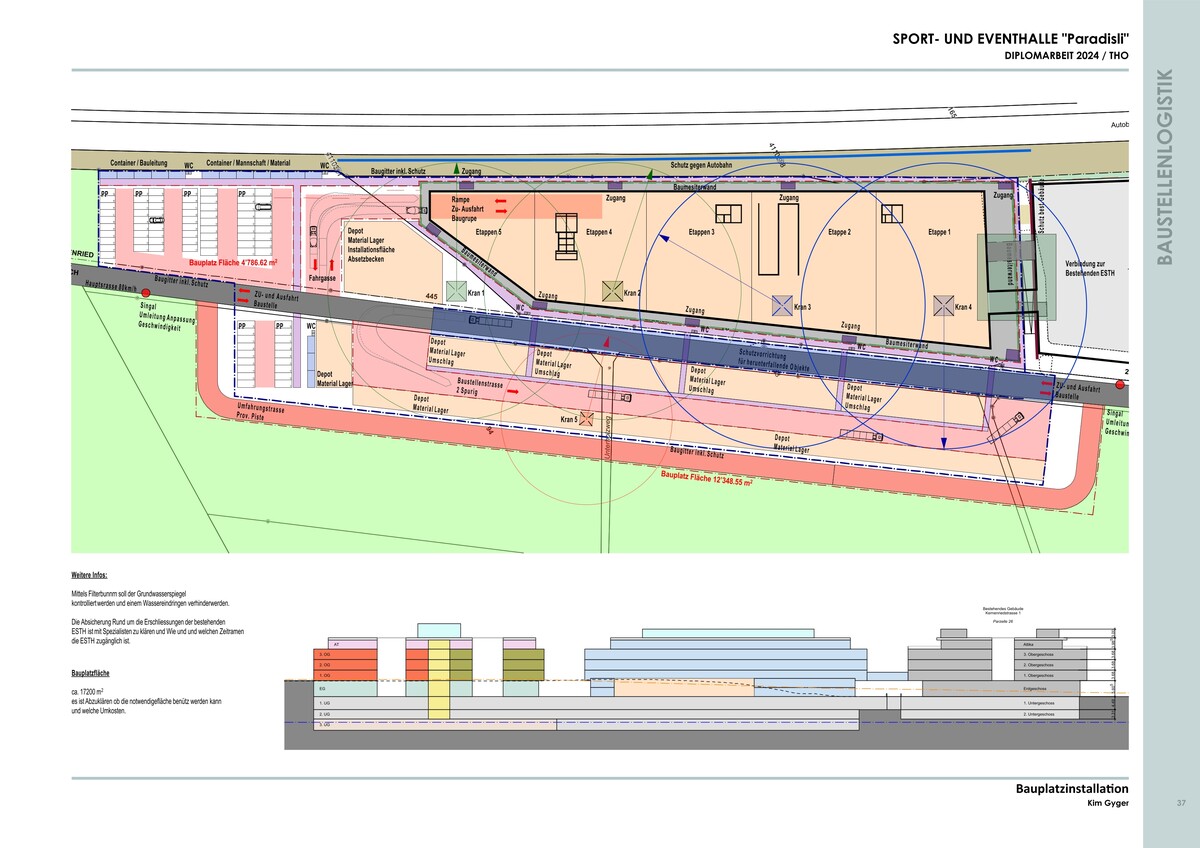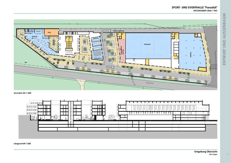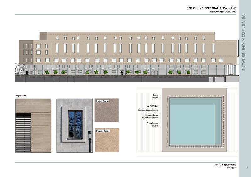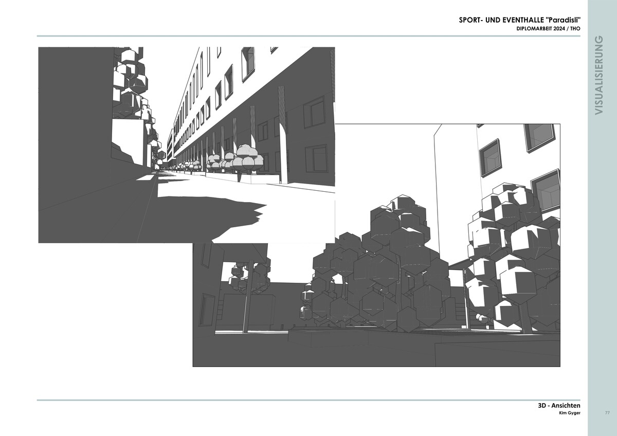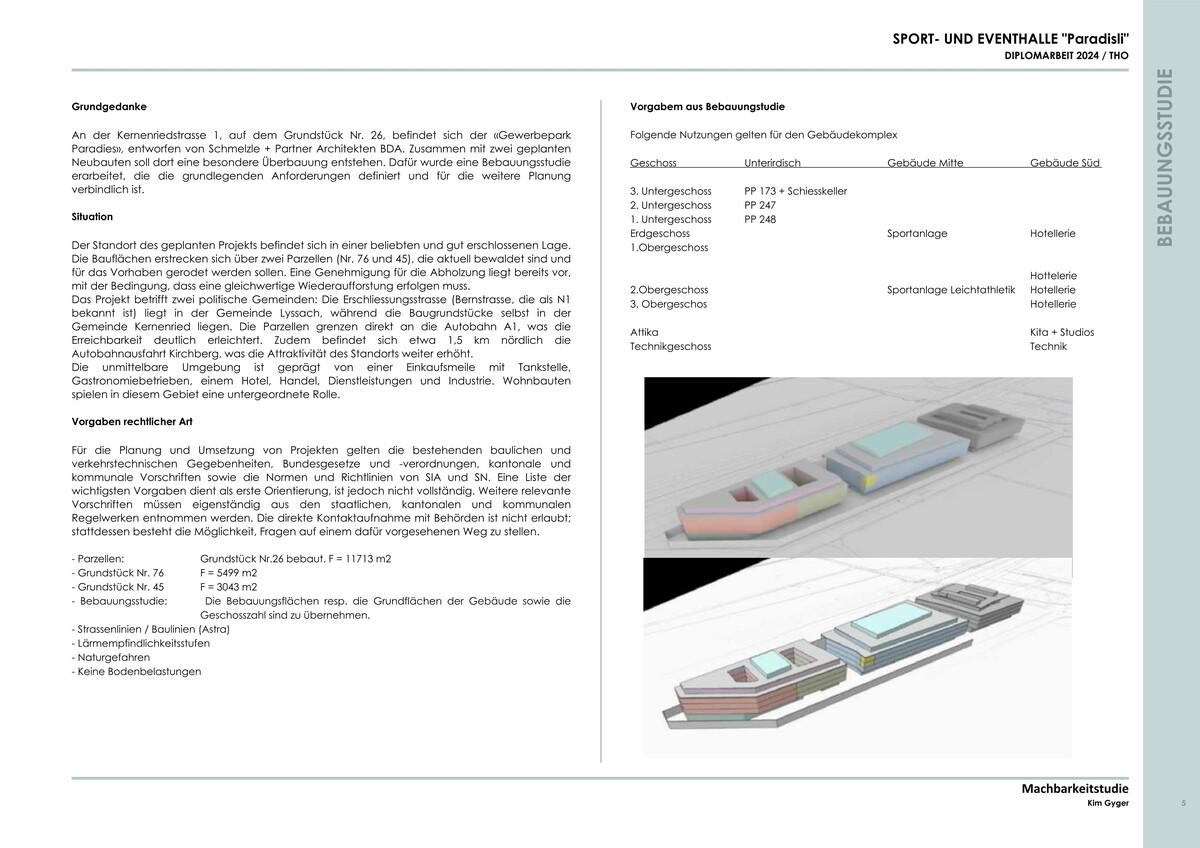 Im Rahmen dieser Arbeit wurde ein umsetzbares Konzept für die Sport- und Eventhalle „Paradiesli“ entwickelt, das die Anforderungen an moderne Bauweise, Nachhaltigkeit und Flexibilität erfüllt. Der Entwurf konzentriert sich auf eine energieeffiziente und ressourcenschonende Bauweise, die durch