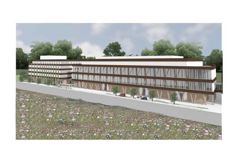 Der Entwurf der Gebäude Mitte und Süd bildet zusammen mit dem bestehenden Haus Nord ein harmonisches Gesamtbild. Jedes Gebäude übernimmt eine eigene Funktion und spiegelt dies in seiner individuellen Gestaltung wider. Zugleich sorgen gemeinsame Elemente wie horizontale Fassadenbänder aus Basalt und V-förmige Holzstützen für eine optische Verbindung und ein einheitliches Gesamtbild.
