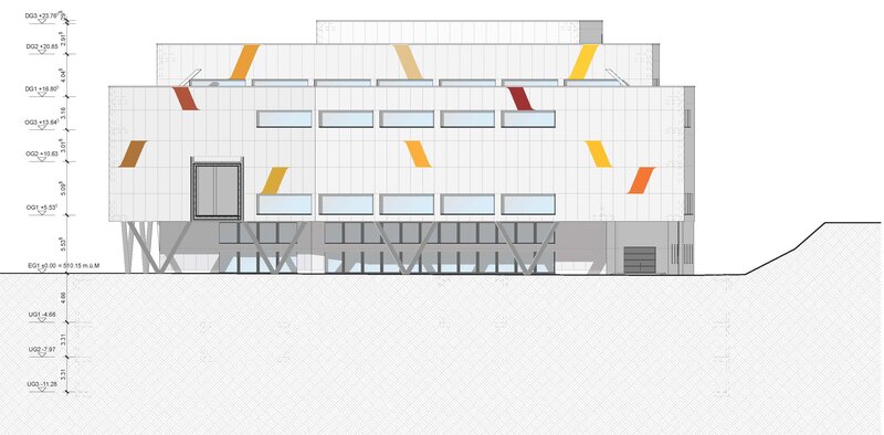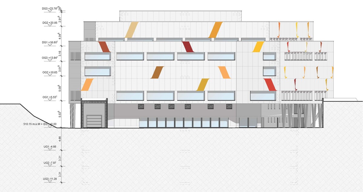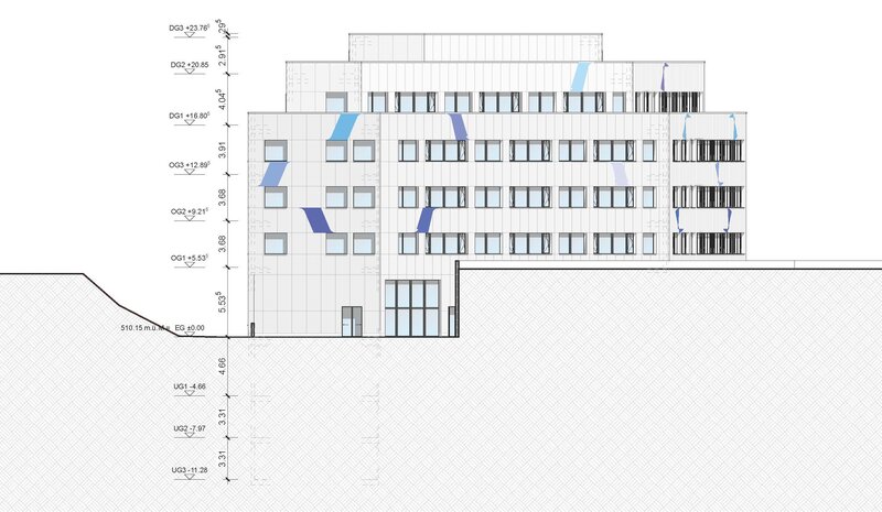Die Tragekonstruktion besteht aus massivem Beton, während die Decken der Hallen als Holz-Beton-Verbundsystem (HBV) ausgeführt sind. Dieses System ermöglicht grosse Spannweiten und löst das Schallproblem durch die Masse des Betons. Im Vergleich zu Stahlbetondecken reduziert HBV den Verbrauch von Stahl und Beton und bietet durch das im Holz gespeicherte CO2 eine nahezu klimaneutrale Lösung. Für die Dämmung habe ich Steinwolle gewählt, die gute Dämmeigenschaften bietet und nachhaltig ist. Die Fassade besteht aus einer hinterlüfteten Konstruktion mit wartungsfreundlichen und langlebigen Recycling-Aluminiumpaneelen.