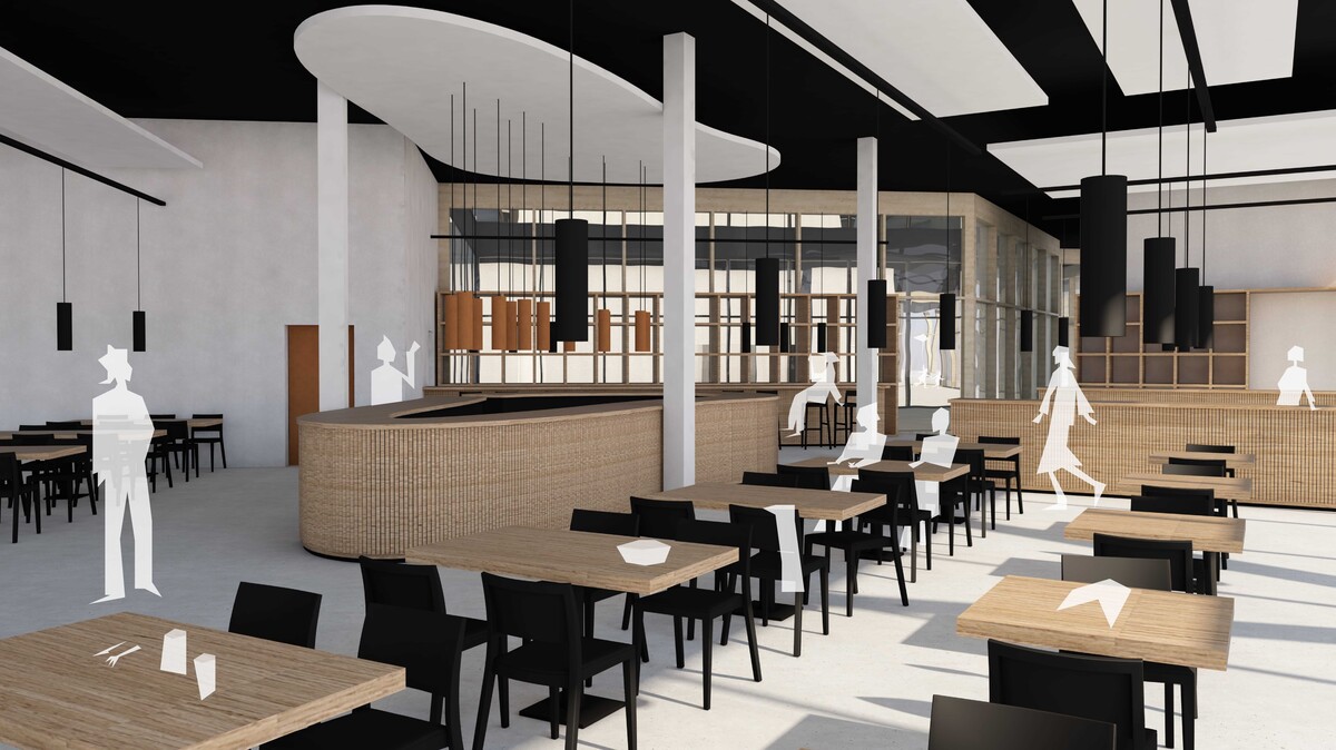 Ein zentrales Element der Innenraumgestaltung ist das Buffetmöbel im Restaurant. Durch seine organische Form bringt es die gestalterischen Elemente des Aussenraums ins Innere und schafft so eine Verbindung zur Umgebung.