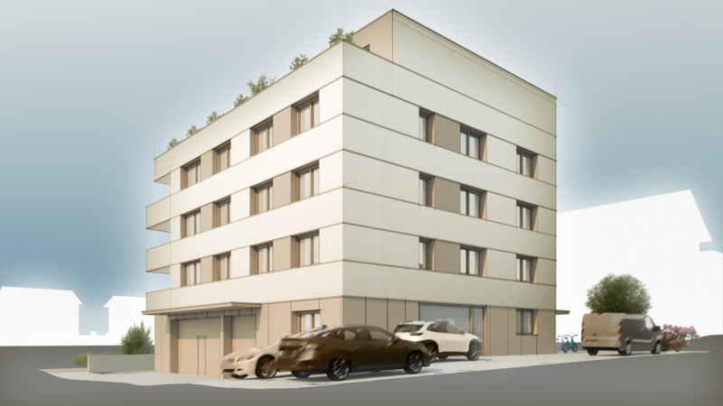 Aus verschiedensten Entwürfen entstand schlussendlich ein fünfstöckiges Gebäude inkl. einer unterirdischen Einstellhalle, welche durch eine Einfahrtsrampe erschlossen wird. Insgesamt entstehen so sechs grosszügige & attraktive Mietwohnungen plus eine grosse Attikawohnung mit Dachterrasse für den Eigentümer. Im Erdgeschoss wird eine grosszügige Autolackierwerkstatt erschaffen und zur befahrenen Strasse hin kann sich das Gewerbe für Bodenbeläge bestens entfalten. Rund um das Gebäude zur Kantonsstrasse hin werden genügend Parkplätze angeordnet und dafür am anderen Ende der Parzelle zum Bach hin eine Zone für die Förderung der Biodiversität geschaffen.