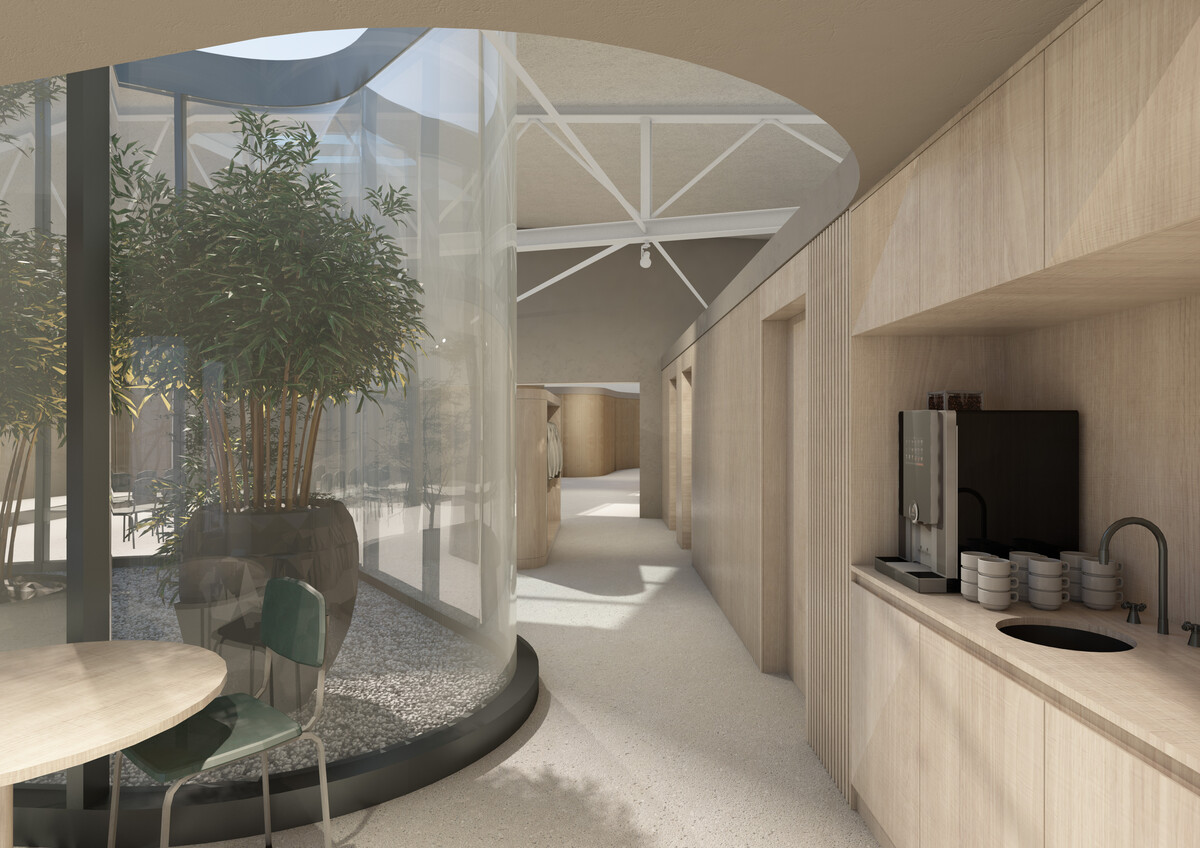 Besonders sticht der architektonische Entwurf mit seinen unkonventionell geschwungenen Linien und dem zentral angeordneten Glas-Atrium heraus. Inspiriert von den Wellen und dem Flusslauf des Rheins, fügen sich die organischen Formen in den urbanen, industriellen Charakter der Halle und schaffen eine behagliche Wohlfühlatmosphäre.