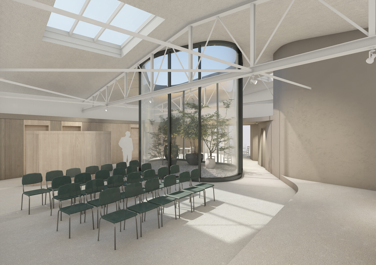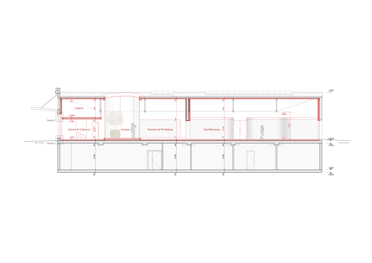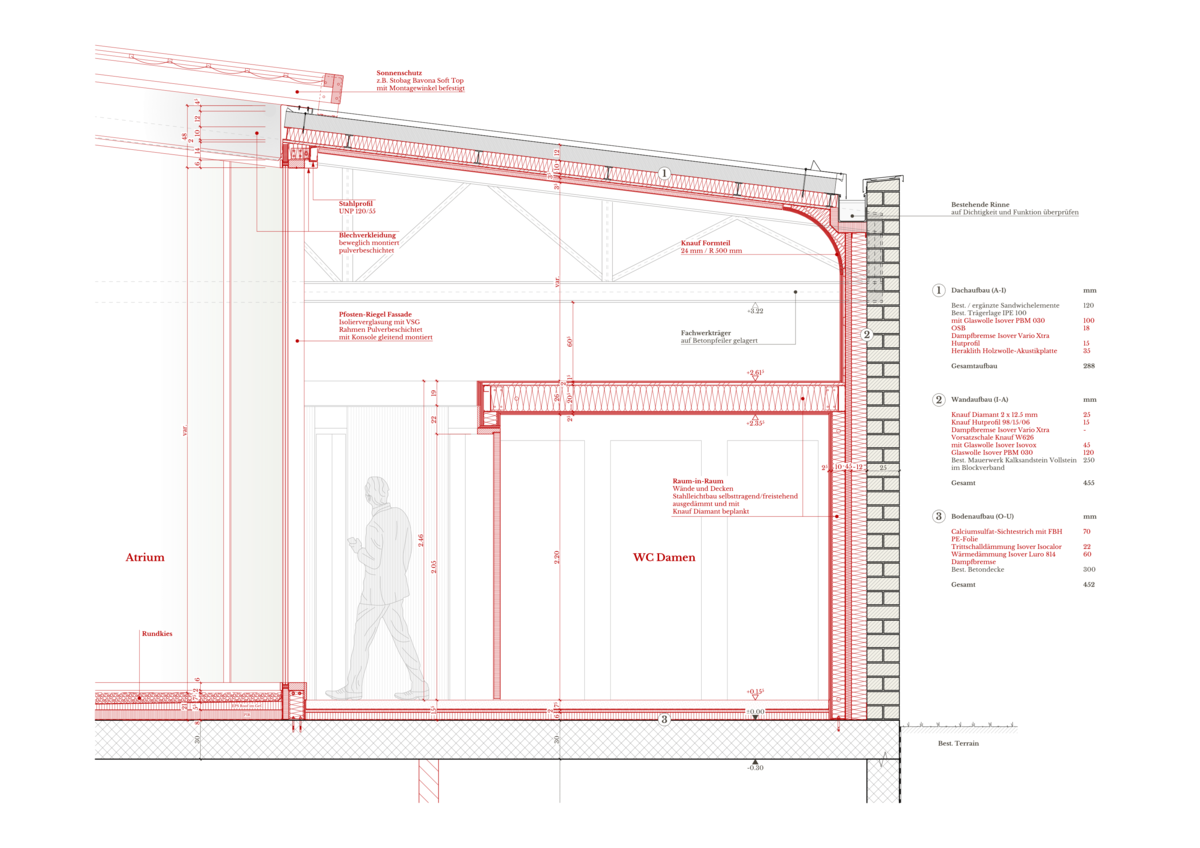 Konstruktiv ist eine Innendämmung mit Vorsatzschale vorgesehen. Die Einbauten erfolgen als Raum-in-Raum-Systeme aus Stahlleichtbau und entsprechen den hohen akustischen Anforderungen. Das Atrium wird als Pfosten-Riegel-Fassade erstellt und öffnet das bestehende Dach. Die bauliche Intervention fordert leichte Anpassungen am Tragwerk.