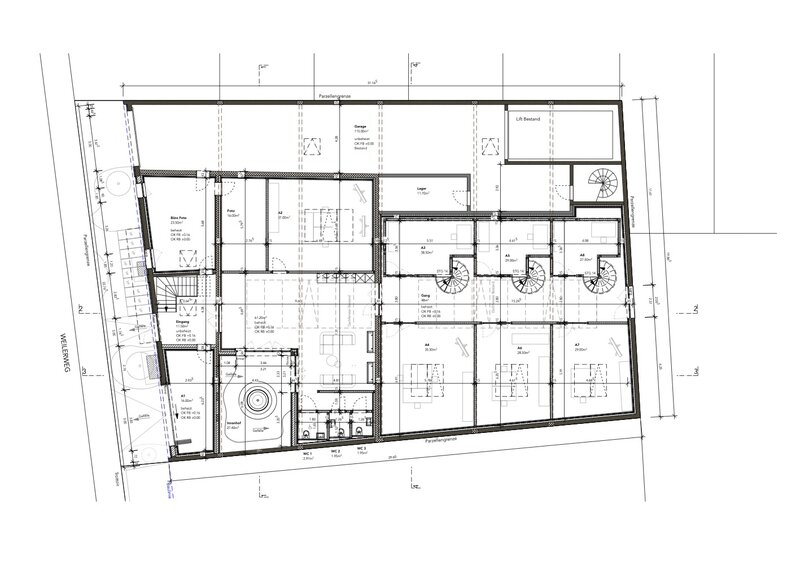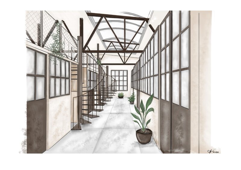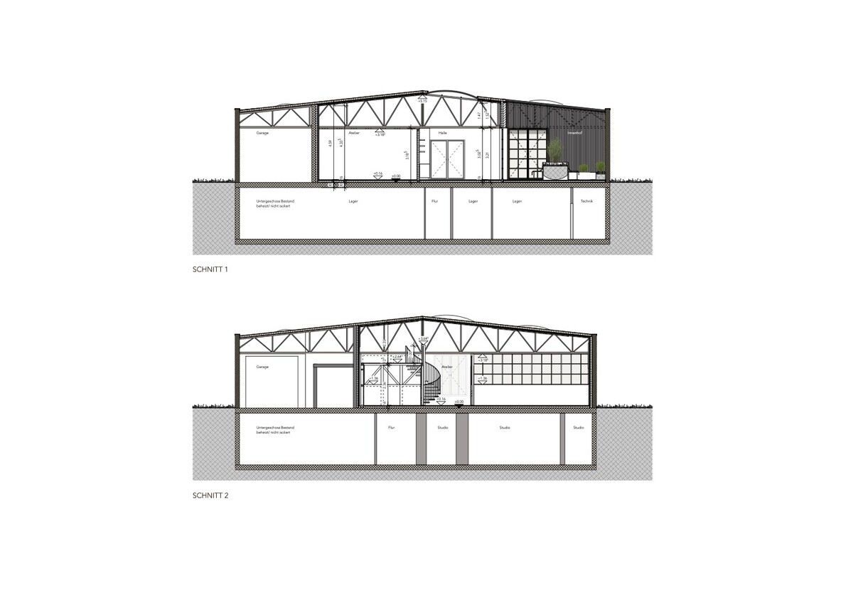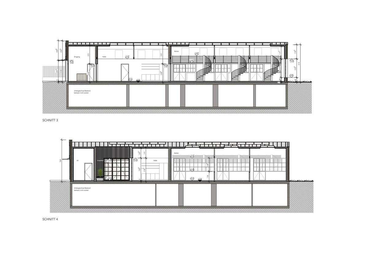 Im Untergeschoss haben sich über die Jahre verschiedene Mieter aus den Bereichen Kultur und Kreativität eingerichtet. Nun soll sich die neue Nutzung im Erdgeschoss diesem Themenfeld anschließen und 8 Ateliers zur Vermietung anbieten.