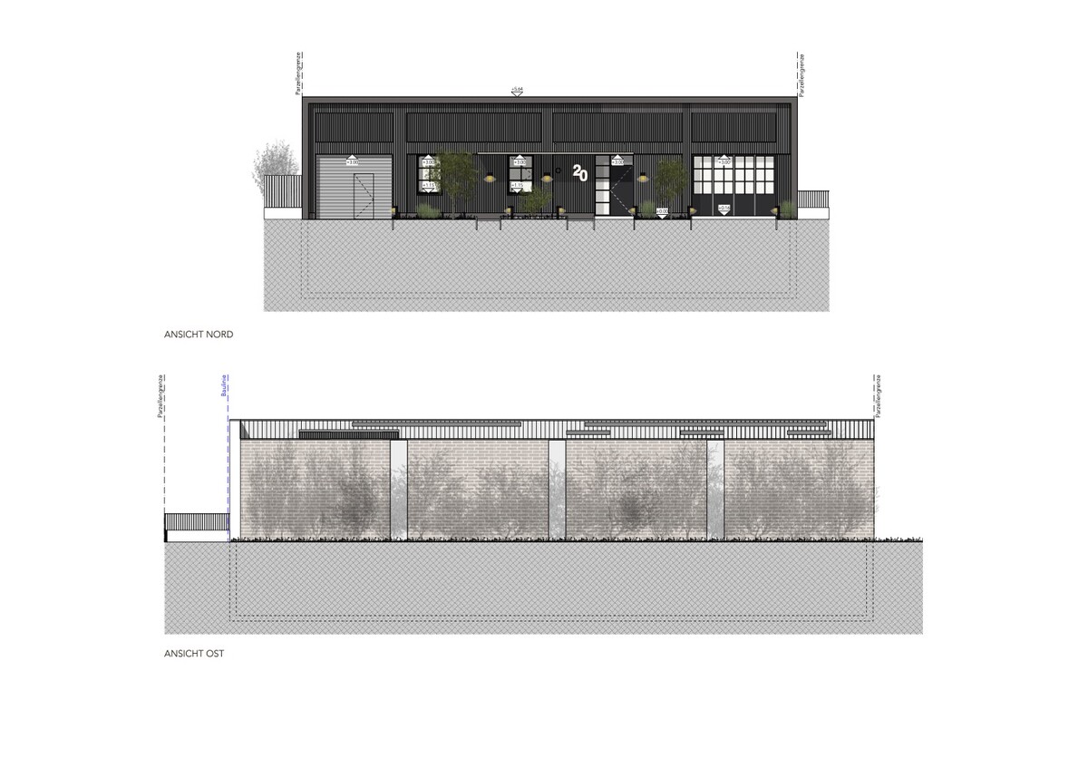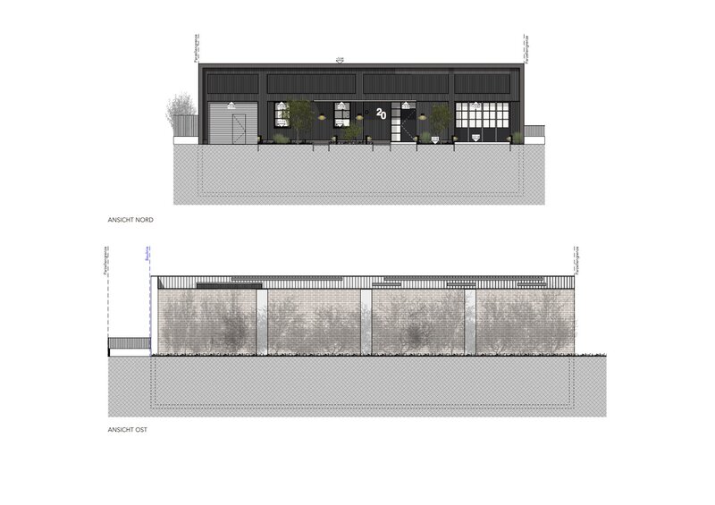 Die Fassade wird neu in einem dunklen Holz verkleidet, die sich deutlich von den Nachbarsgebäude absetzt aber sehr modern erscheint und sich gut an das angrenzende Industriegebiet anfügt.