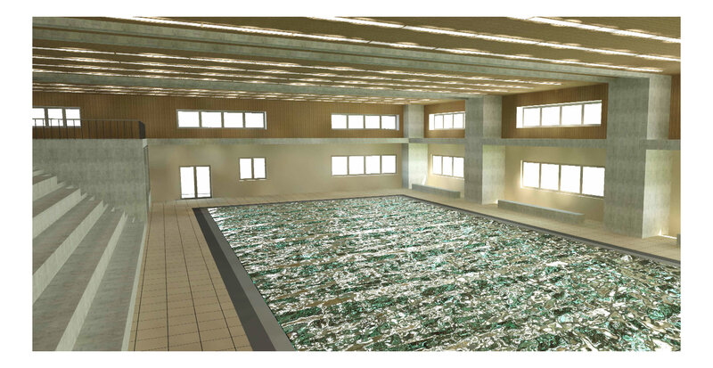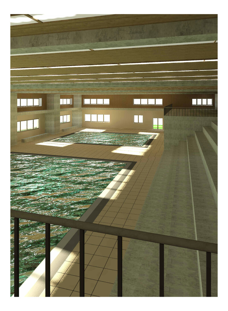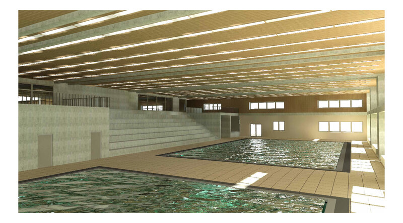 Auf der Rasenfläche der Spielwiese wurde ein neues Hallenbad geplant, welches für die Schule aber auch für die Öffentlichkeit zugänglich sein wird. Durch klare Unterteilungen wird ein reibungsloser Ablauf für beide Nutzungen gewährleistet.